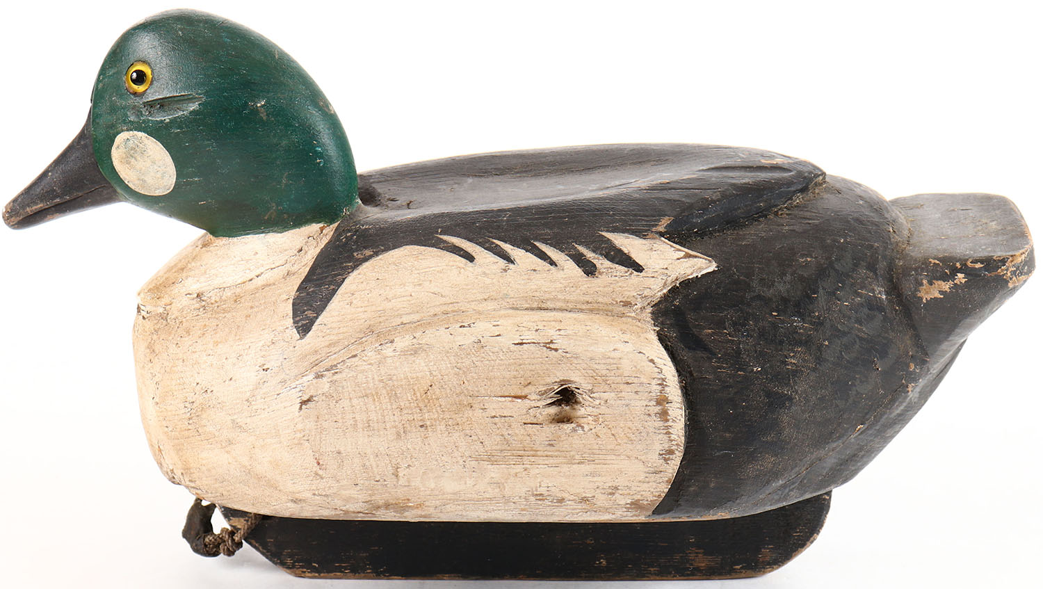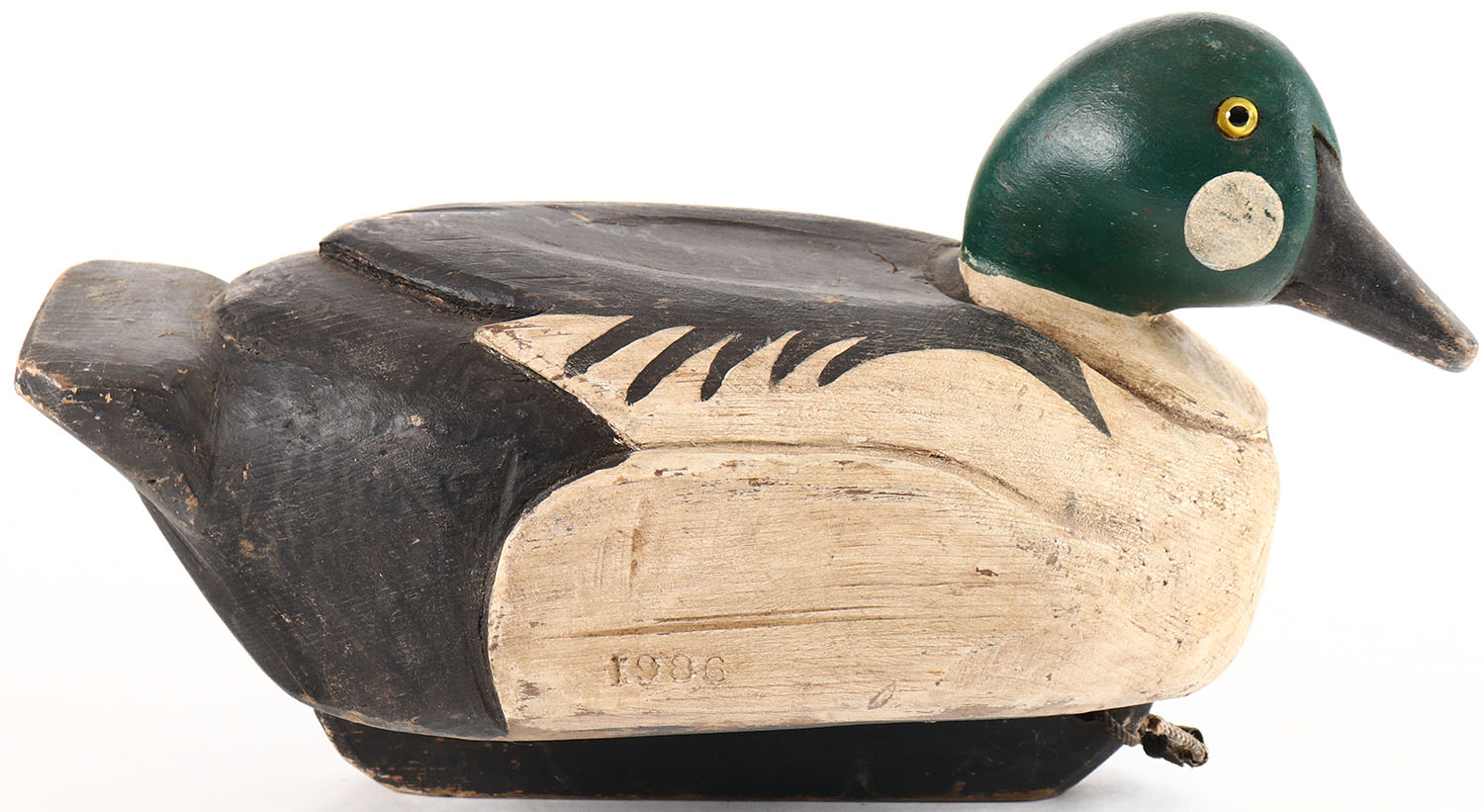Goldeneye Drake by unknown maker, glass eyes, solid wood, original paint, has age cracks under neck. Grade: Very Good + - Value: 20 to 40