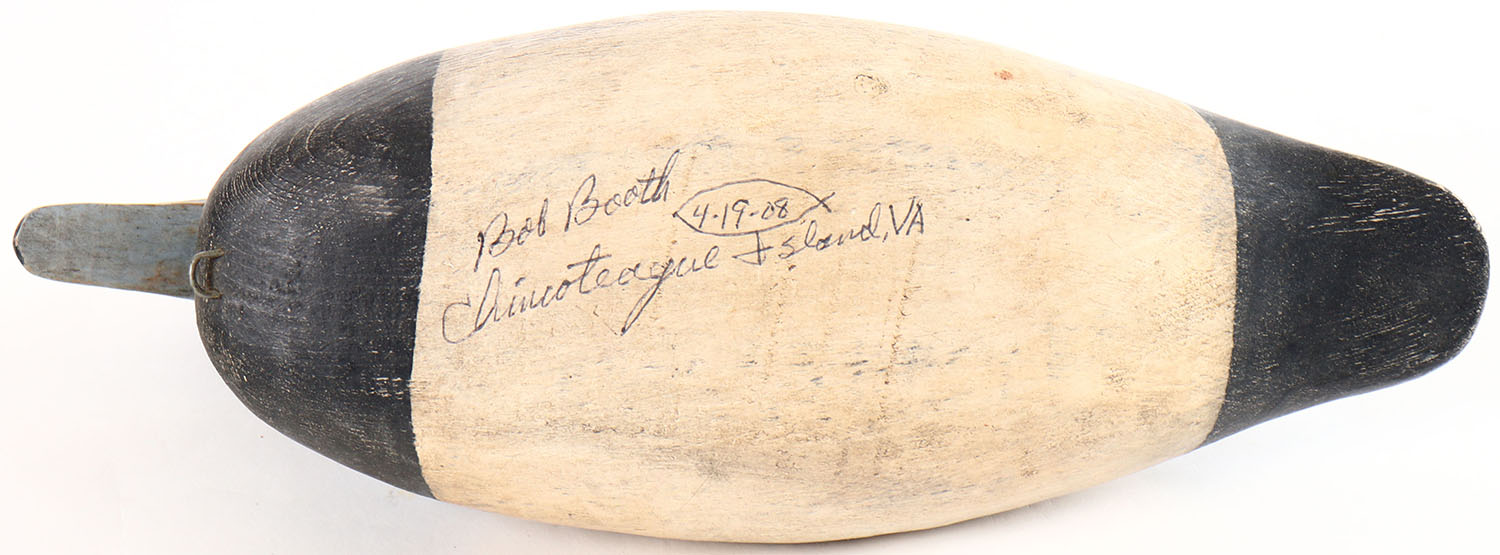 Bluebill Drake by Bob Booth, Chincoteague Island, VA. Painted eyes, solid wood, original paint, structurally excellent, signed on bottom by BOB BOOTH. Grade: Excellent - Value: 20 to 40