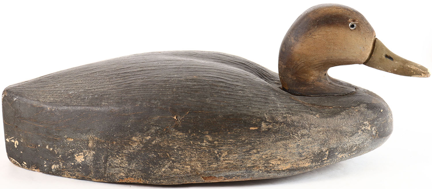 Black Duck by Wildfowler, Atlantic model, glass eyes, solid wood, original paint with some wear, has age cracks on back, chip above eye. Grade: Very Good ++ - Value: 40 to 80