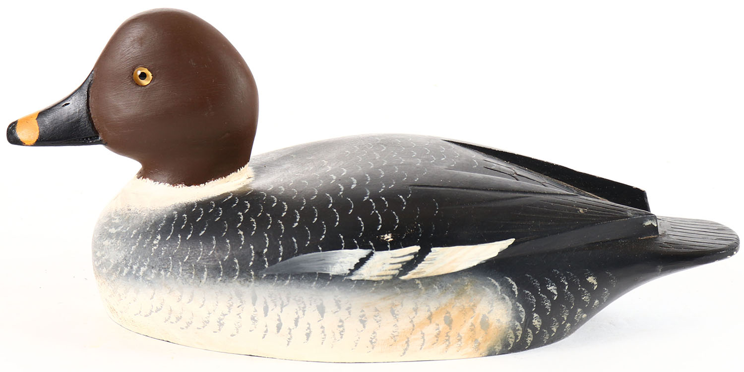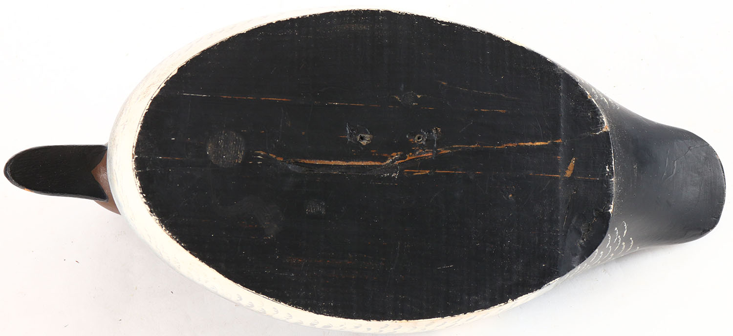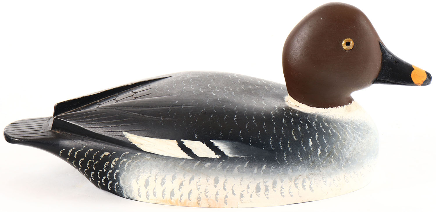 Goldeneye Hen by Reggie Blooms or David Nichols, Ontario, glass eyes, solid wood, original paint, structurally excellent. Grade: Excellent ++ - Value: 70 to 150