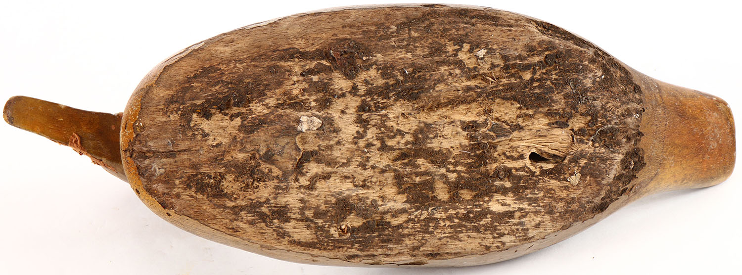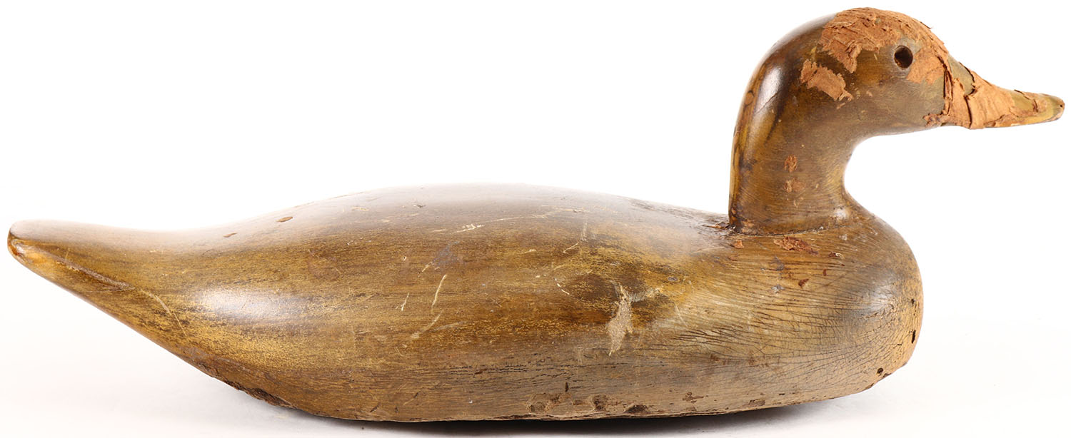 Mallard Hen by unknown maker, no eyes, solid wood, original paint, has wear to body. Grade: Very Good - Value: 20 to 40