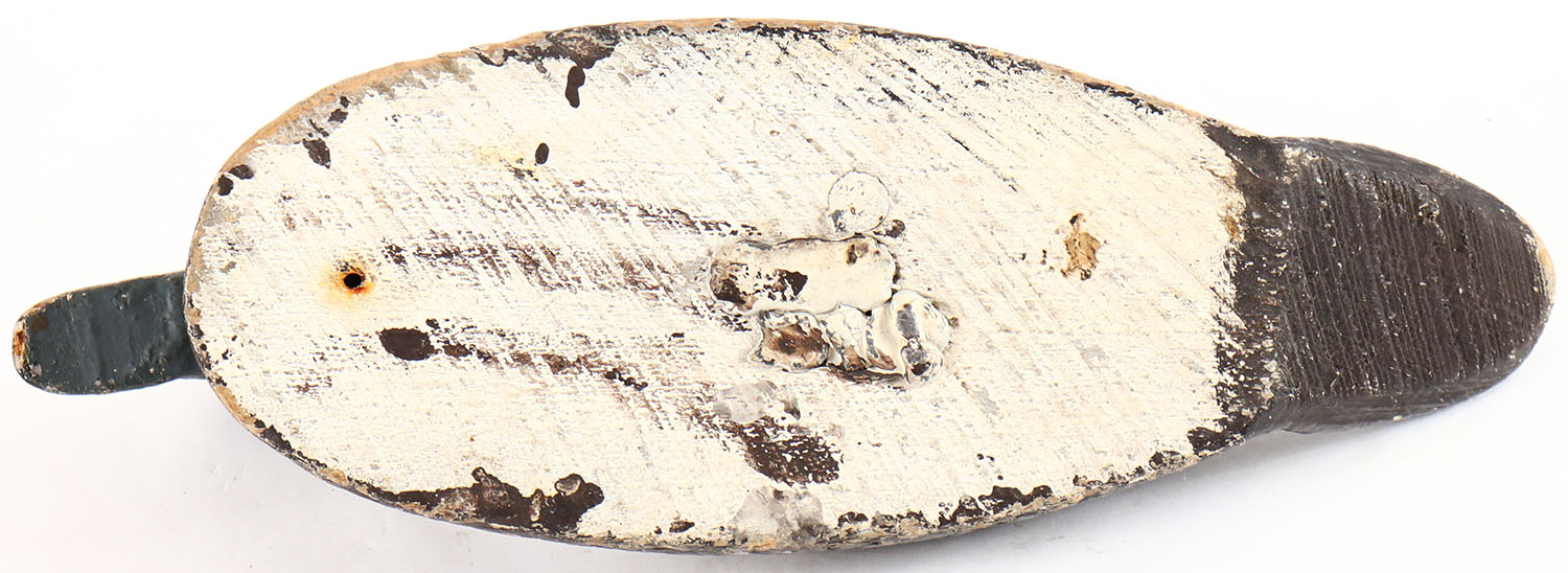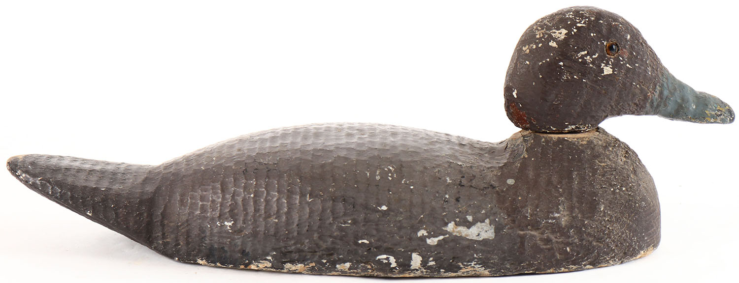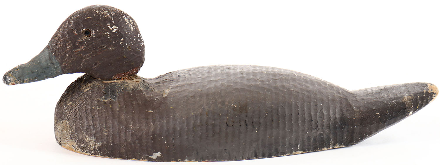 Bluebill Hen by a Pascagoula, MS factory, glass eyes, solid wood, repainted, head is loose. Grade: Very Good - Value: 10 to 30