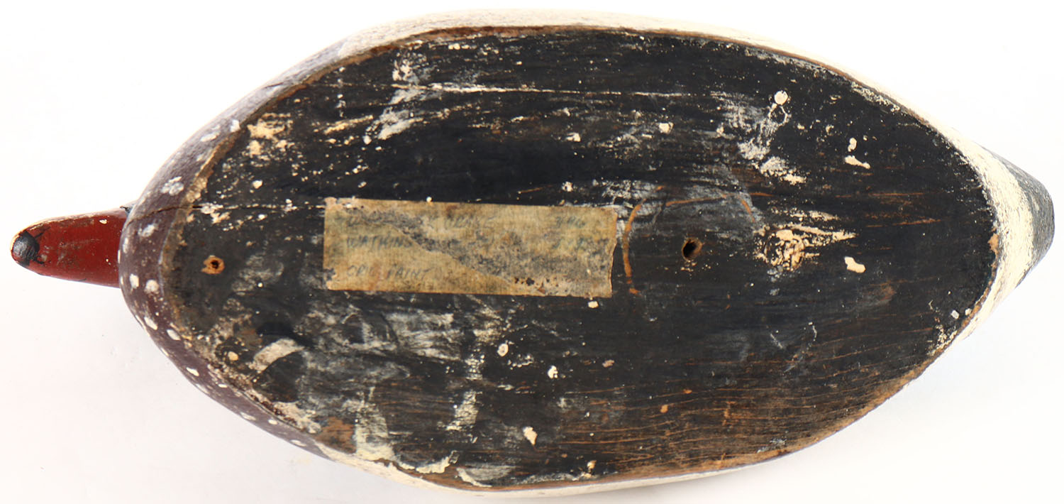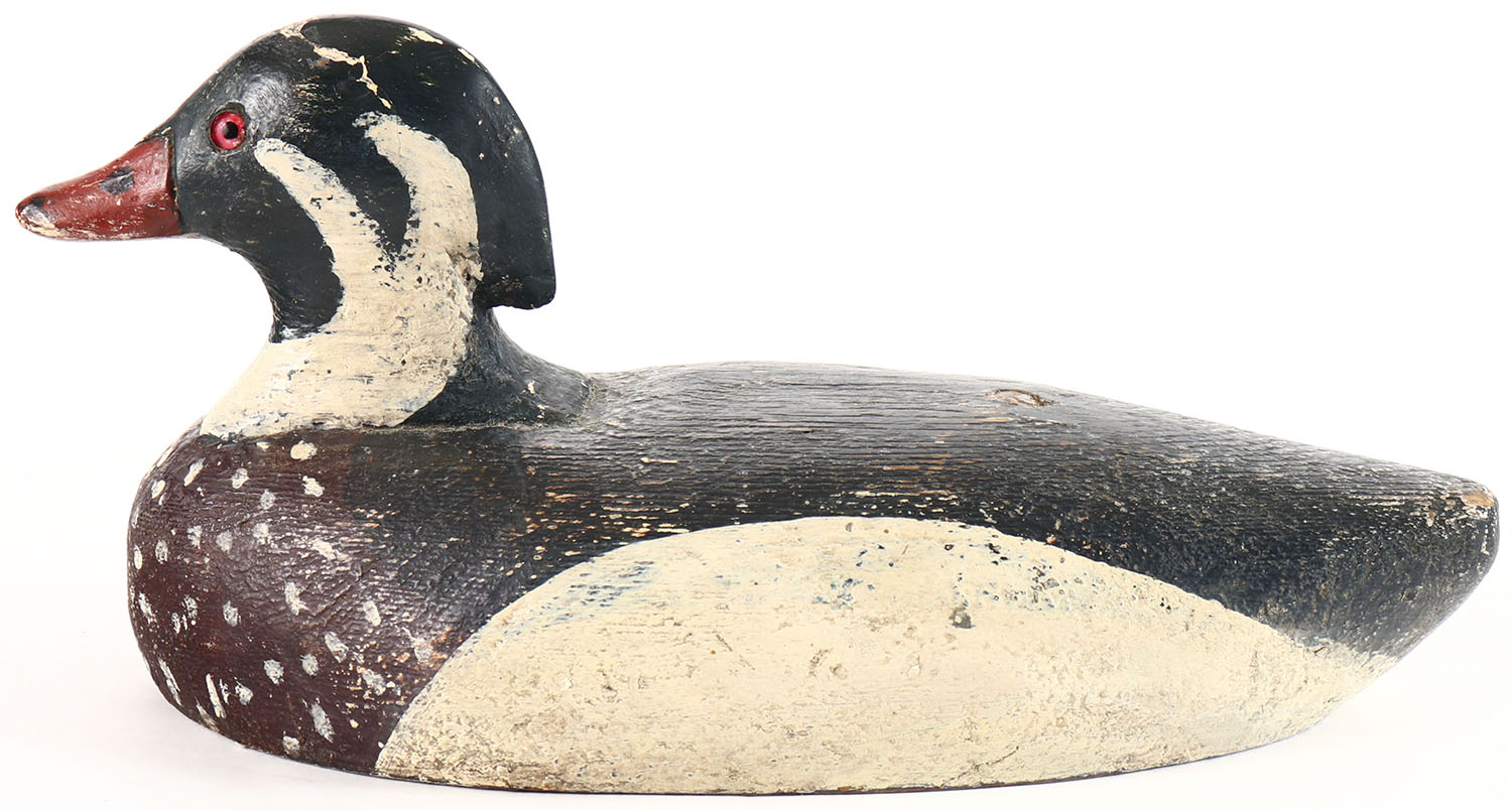Woodduck Drake by unknown maker, glass eyes, solid wood, original paint, has chips on head and body. Grade: Very Good + - Value: 10 to 30