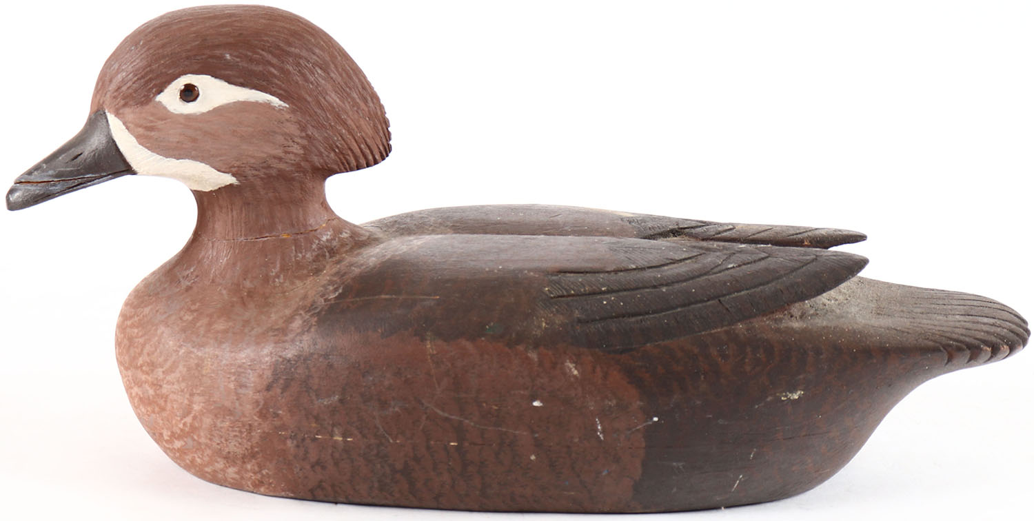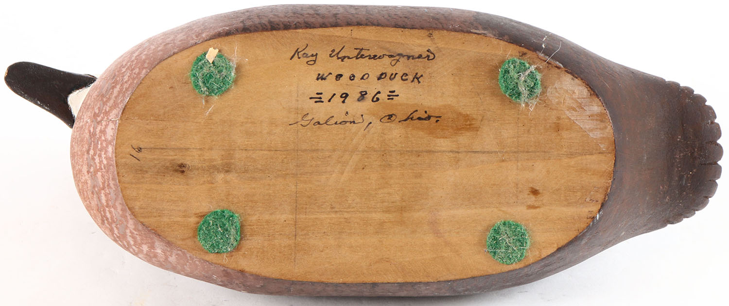 Woodduck Hen by Ray Unterwagner?, glass eyes, solid wood, original paint, structurally excellent, signed on bottom. Grade: Excellent ++ - Value: 20 to 40