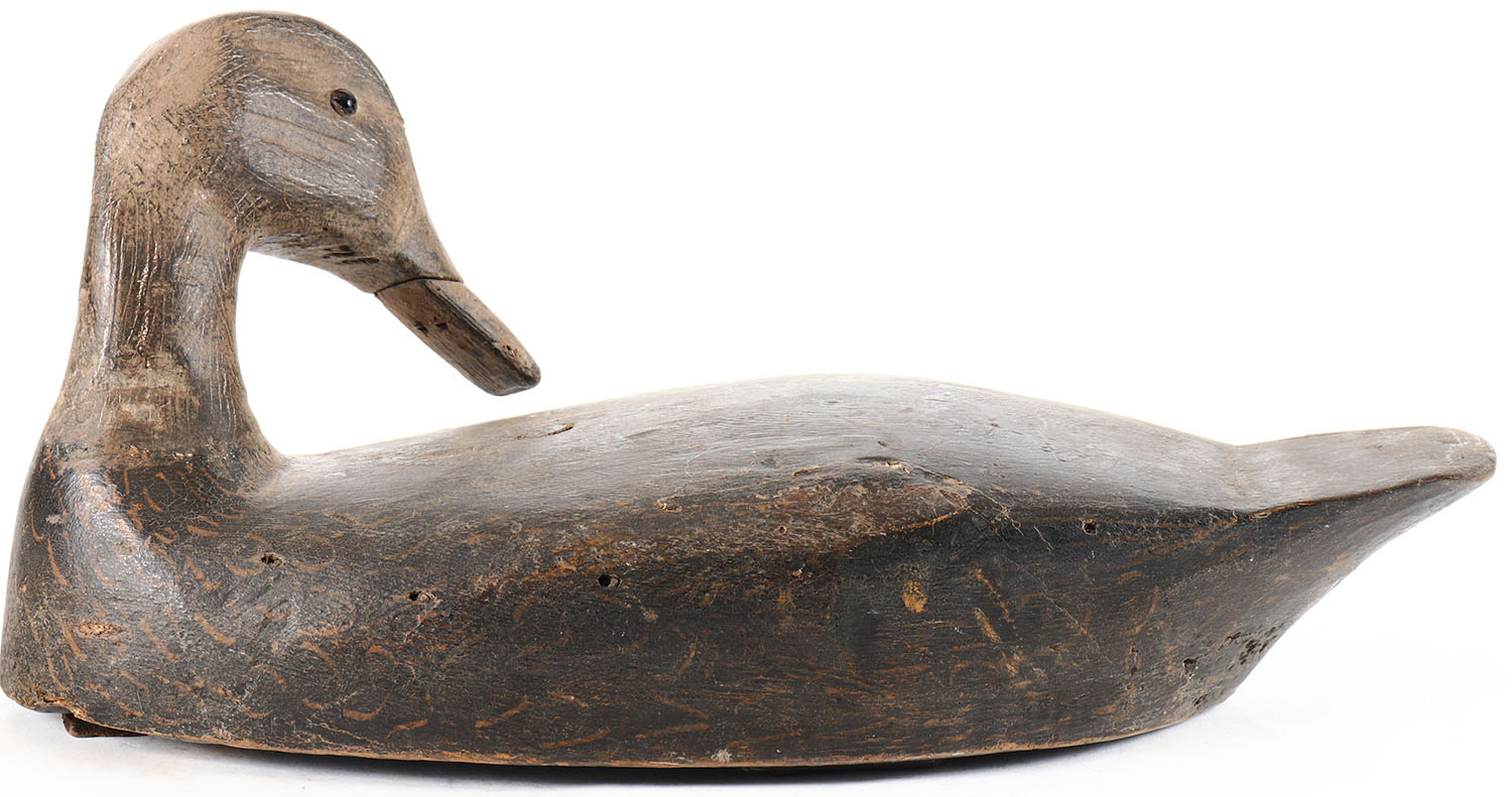 Preening Black Duck by Jessie Baker, Trenton, Ont, head repaired, repainted and possibly turned into a preener, glass eyes, solid wood, original paint, structurally excellent. Grade: Excellent - Value: 20 to 40
