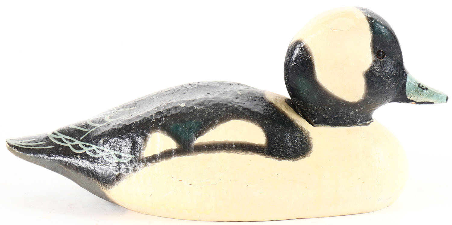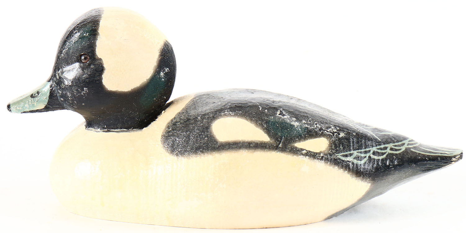 Bufflehead Drake by Herters Decoy Co., Waseca, MN, 1893 series, glass eyes, solid wood, original paint possibly covered in a coat of varnish, structurally excellent, unbranded. Grade: Excellent - Value: 20 to 40
