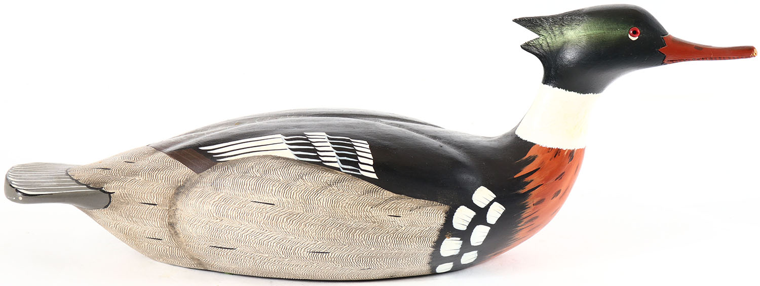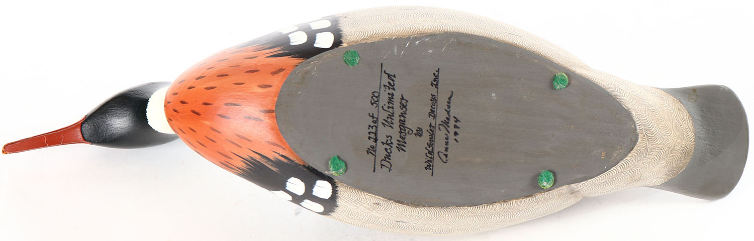 Red Breasted Merganser from Ducks Unlimited, produced by Wildfowler Decoys Inc., glass eyes, solid wood, original paint with comb painting on both sides of body, structurally excellent, signed and branded on bottom by WILDFOWLER DECOYS INC. Grade: Excellent ++ - Value: 30 to 60