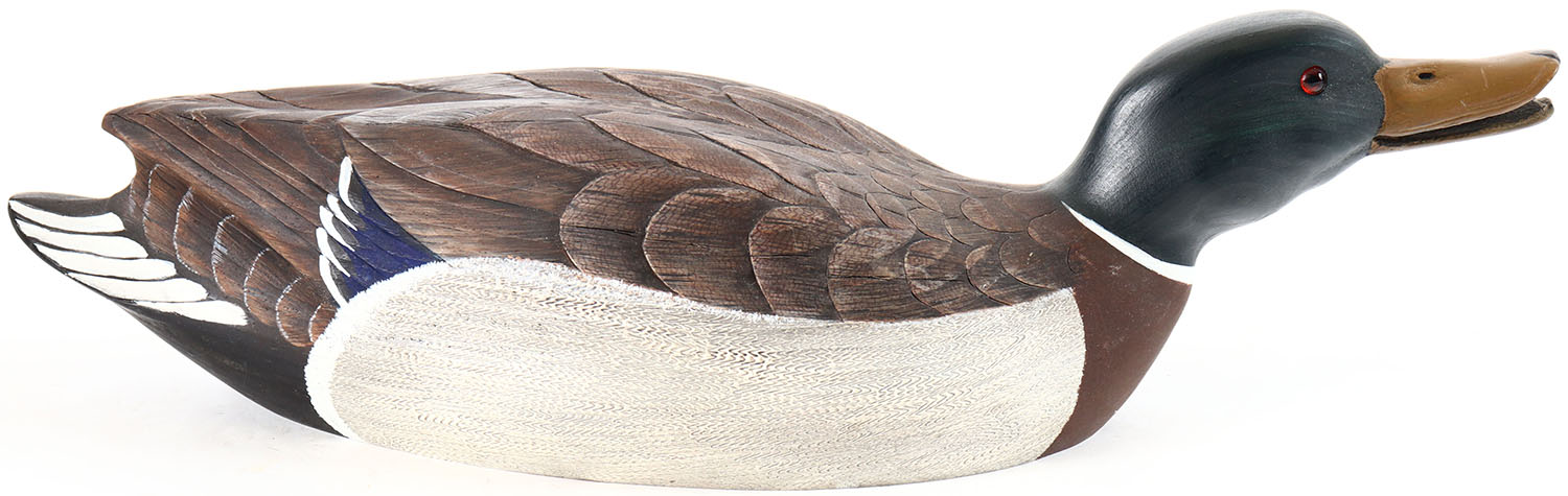 Swimming Mallard Drake by Barbara Kearns, St. Louis, MO. Glass eyes, solid wood, original paint with comb painting on both sides of body, structurally excellent, signed and branded on bottom by BARBARA KEARNS. Grade: Excellent ++ - Value: 10 to 30