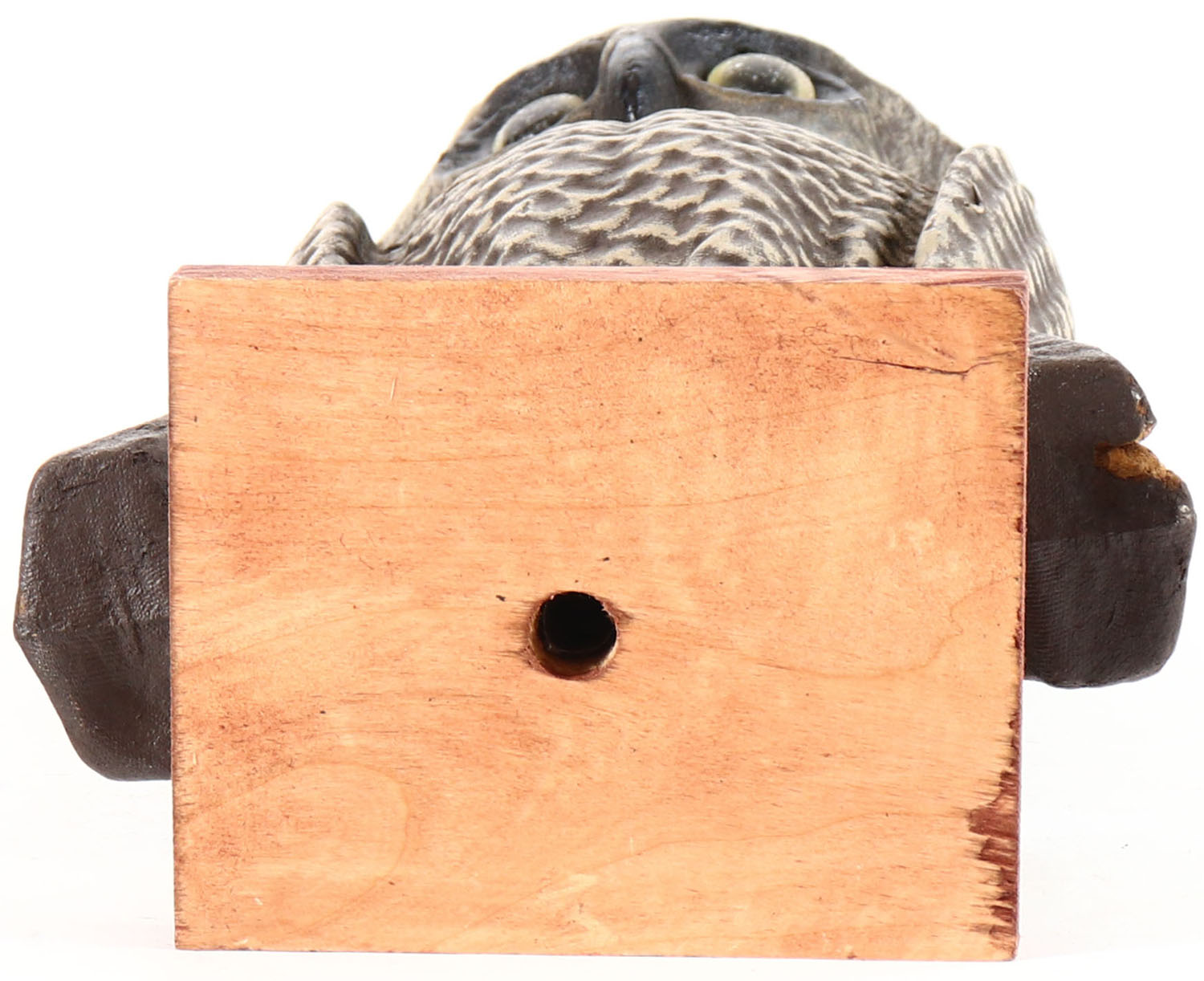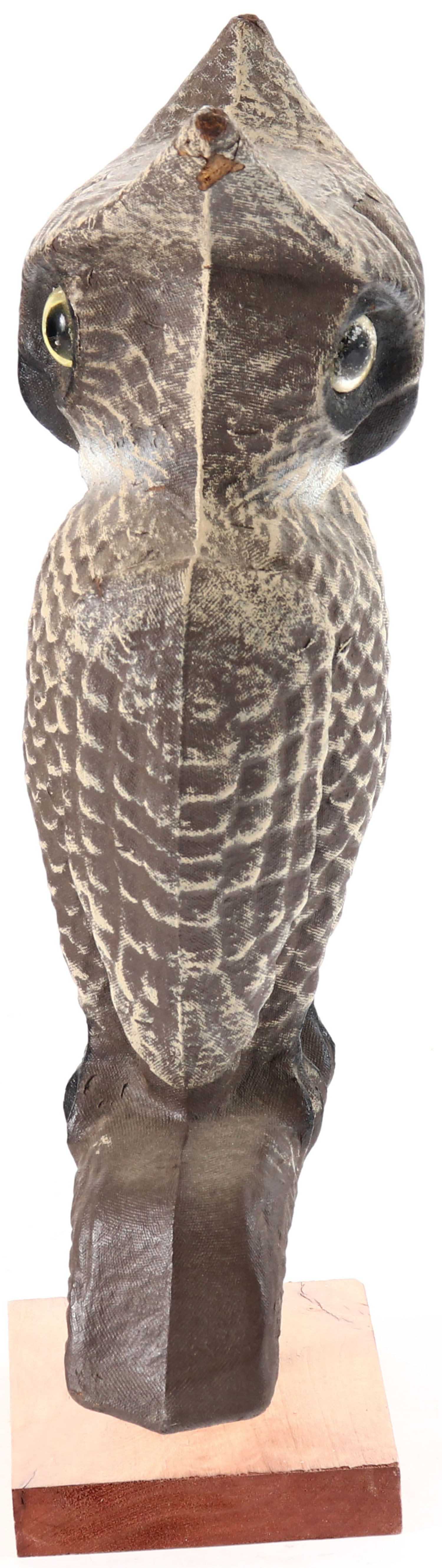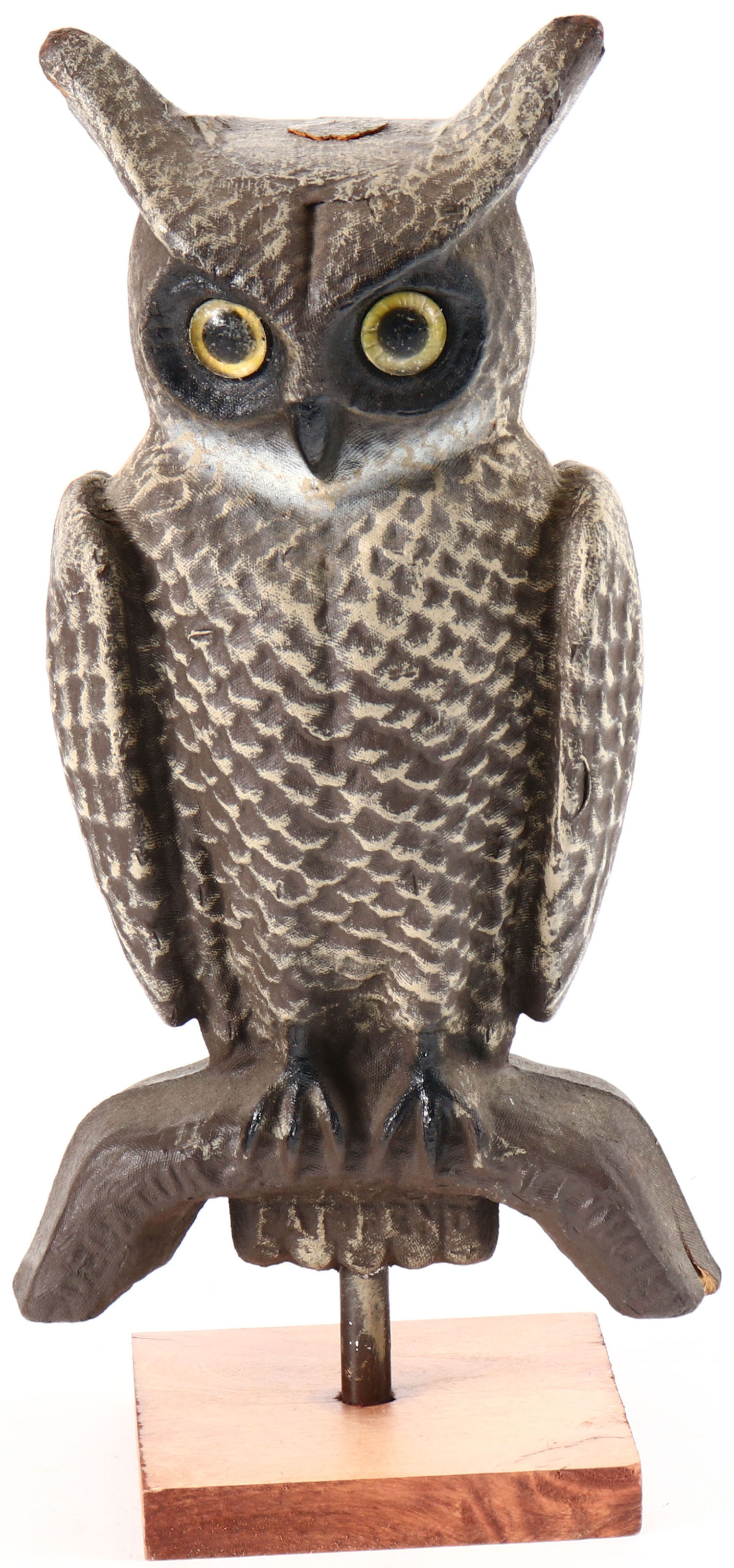Two Sided Paper Mache' Owl by Swisher and Soules, Decatur, IL, glass eyes, on solid wood base, paper mache body, original paint, structurally excellent with minor wear on ear. Grade: Excellent + - Value: 20 to 50