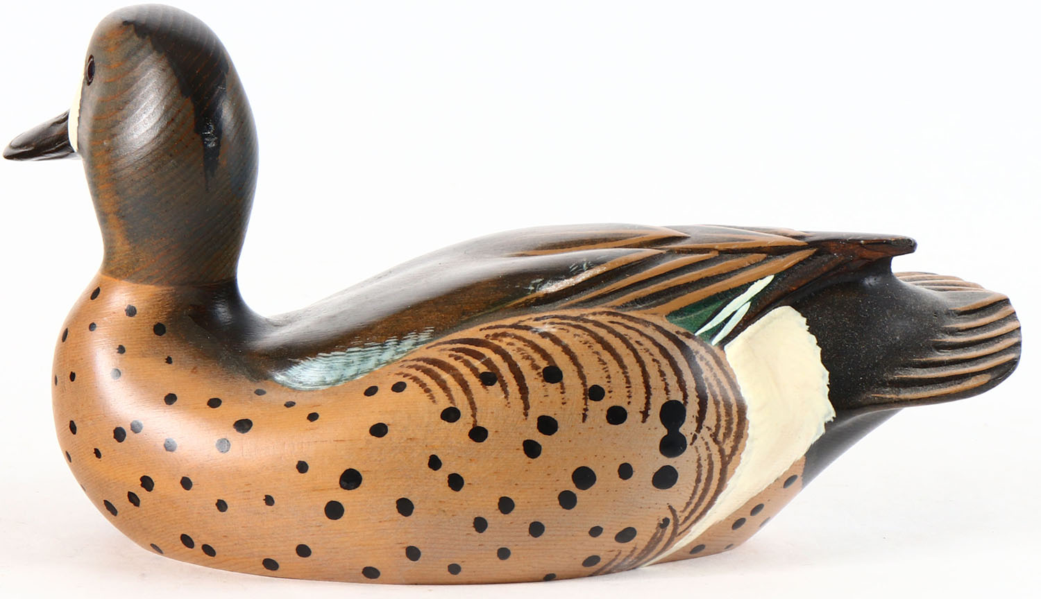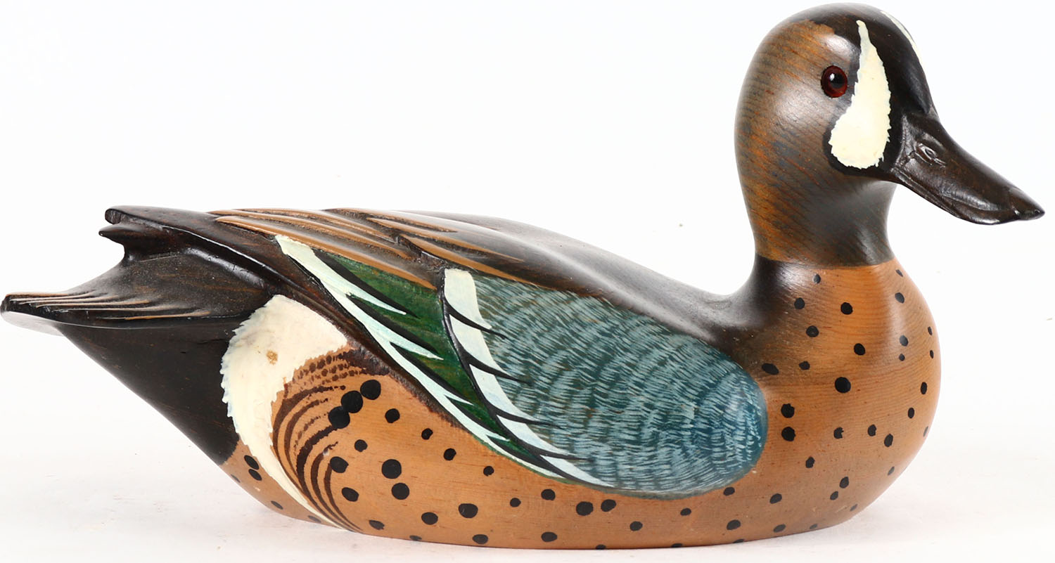 Blue Winged Teal Drake by Ducks Unlimited American Trial Series, glass eyes, solid wood, original paint, structurally excellent, branded by DUCKS UNLIMITED on bottom. Grade: MINT - Value: 10 to 40