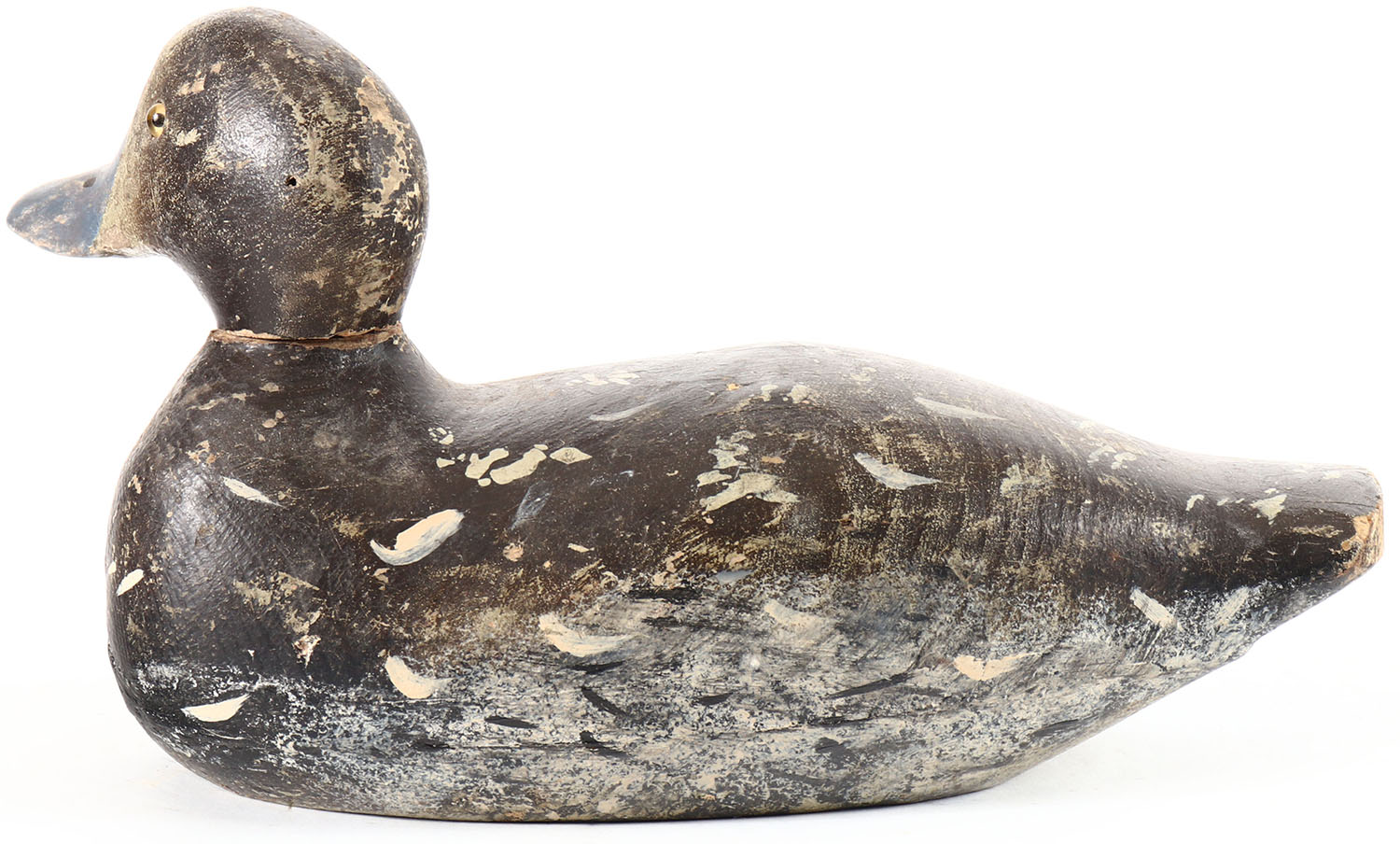 Bluebill Hen by Pratt Decoy Co., Chicago, IL, 1921-1939, glass eyes, solid wood, mixture of original paint and working touch-up, has wear to body. Grade: Very Good ++ - Value: 10 to 40