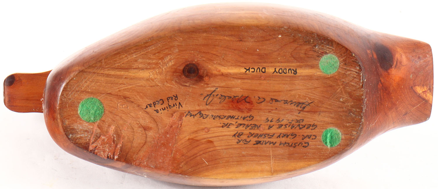 Ruddy Duck by Gervaise A. Neale Jr., Gaithersburg, MD, glass eyes, solid wood, never painted, structurally excellent, signed on bottom. Grade: Excellent - Value: 10 to 20