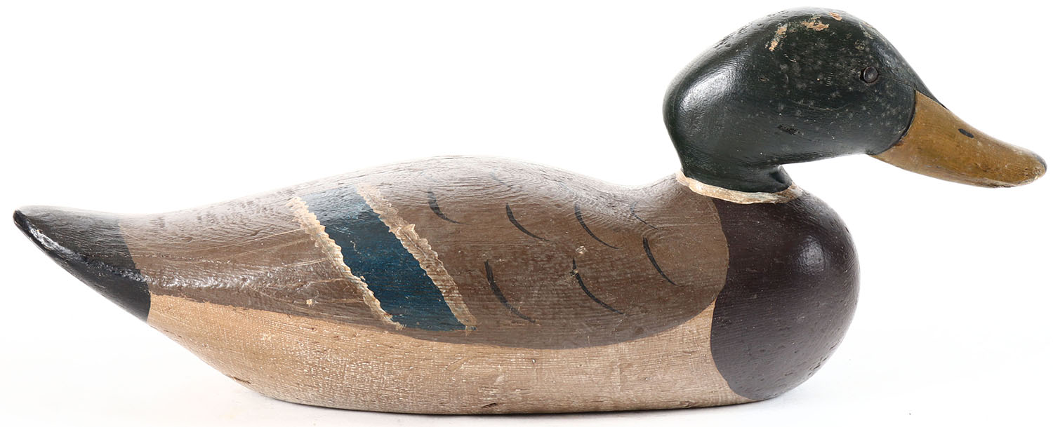 Mallard Drake by Dodge Decoy Factory, Detroit, MI, 1883-1893, tack eyes, solid wood, restored paint, has pellet holes on body and head. Grade: Very Good - Value: 40 to 80