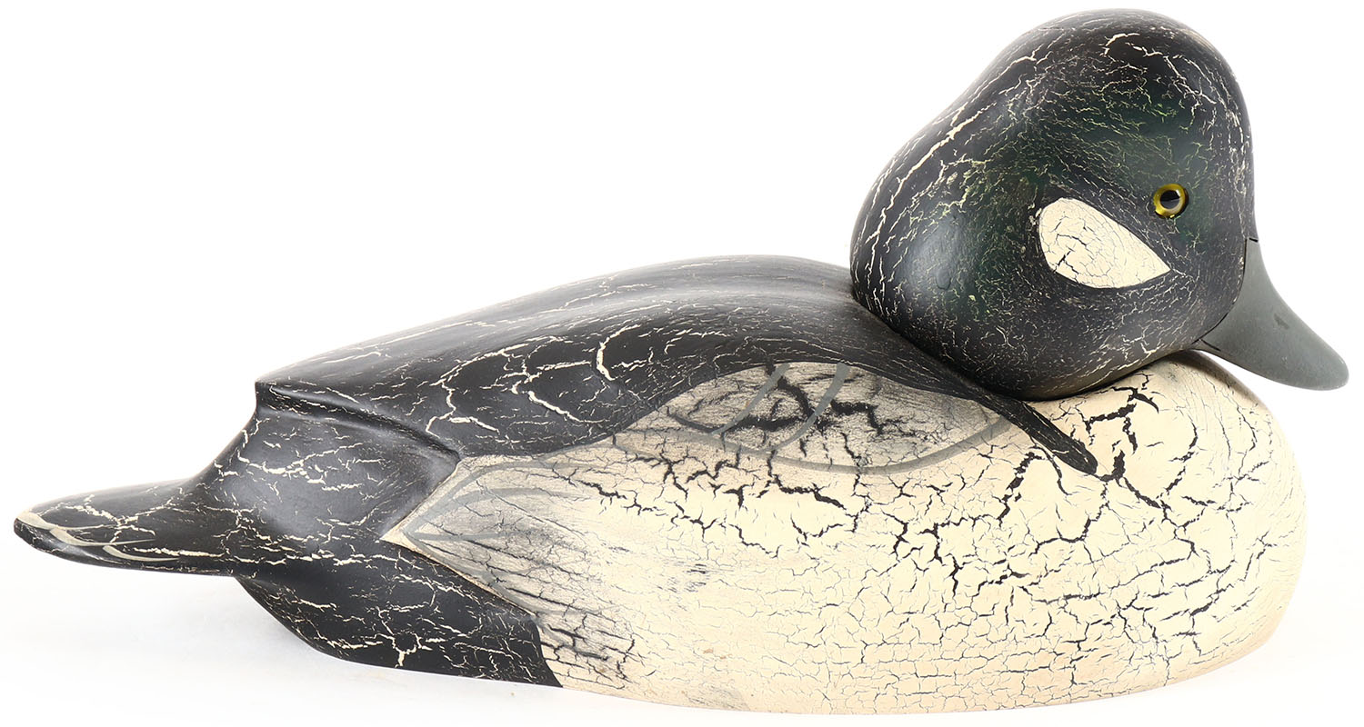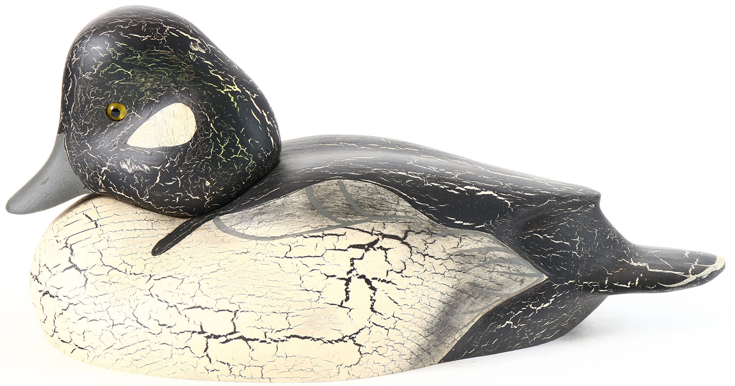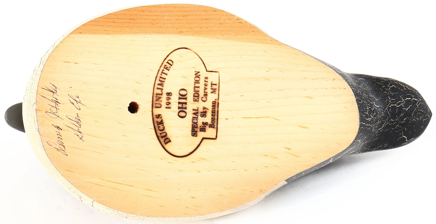 Goldeneye Drake by Ducks Unlimited, Ohio, Special Edition, Big Sky Carvers, Bozeman, MT. glass eyes, solid wood, original paint, body and head have age cracks. Grade: Very Good + - Value: 10 to 40