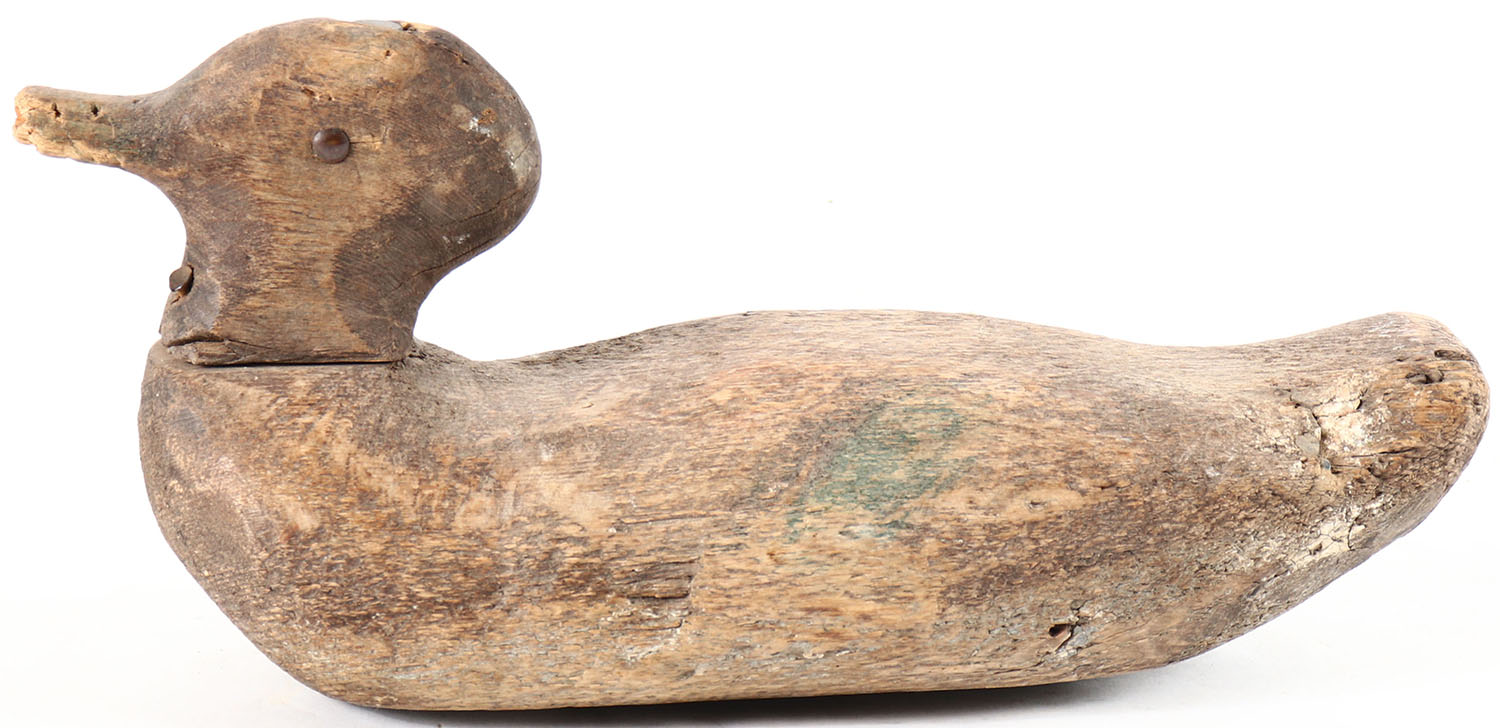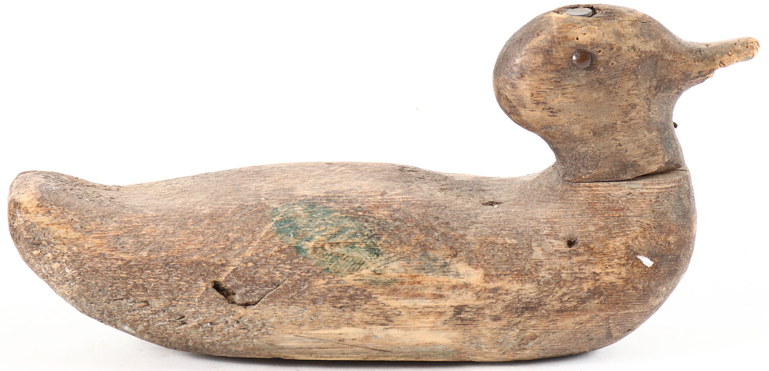 Green Wing Teal by unknown maker, tack eyes, solid wood, original paint, has age cracks on back and bottom. Grade: Very Good - Value: 6 to 20