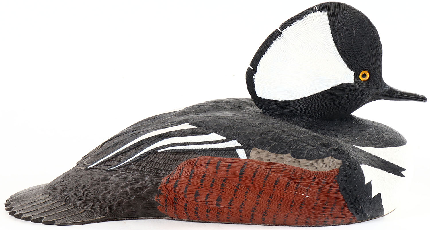Hooded Merganser by Sam Nottleman, glass eyes, solid wood, original paint, structurally excellent, signed on bottom by SAM NOTTLEMAN on bottom. Grade: Excellent + - Value: 20 to 40