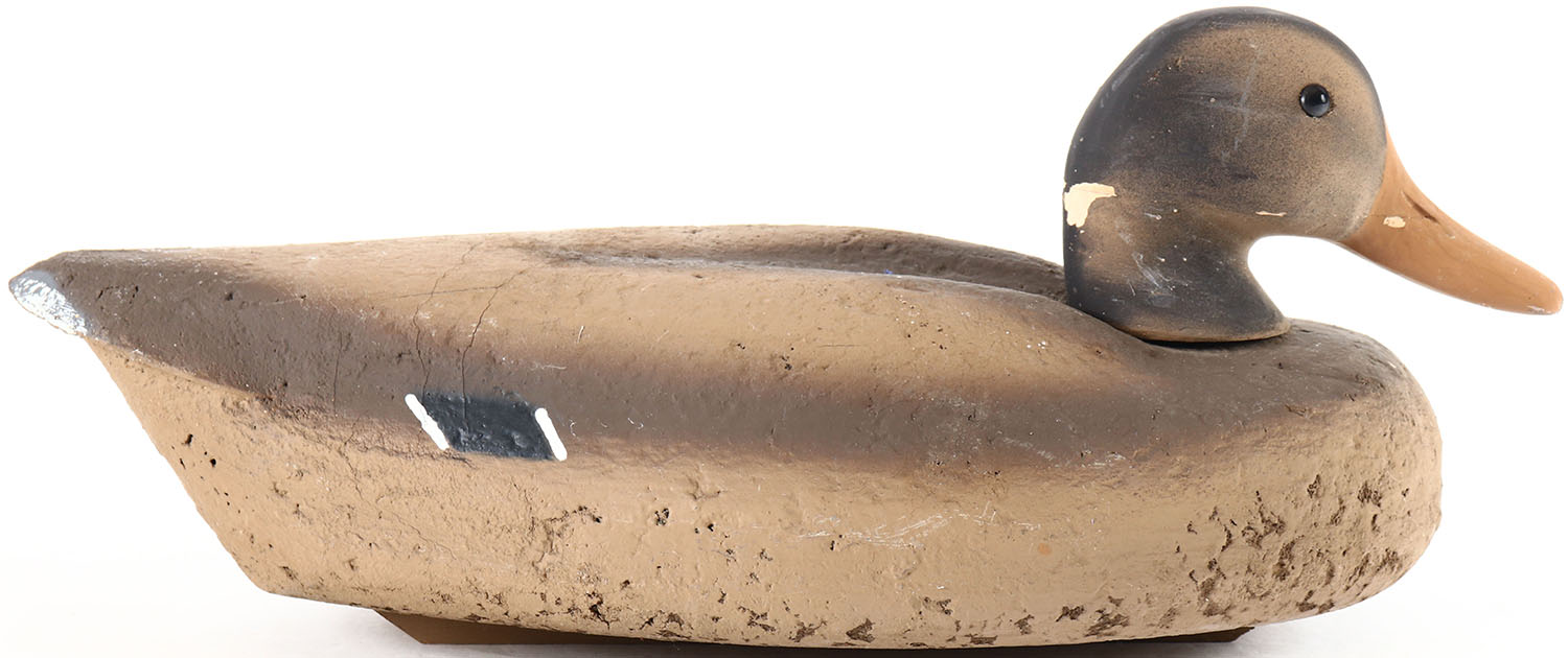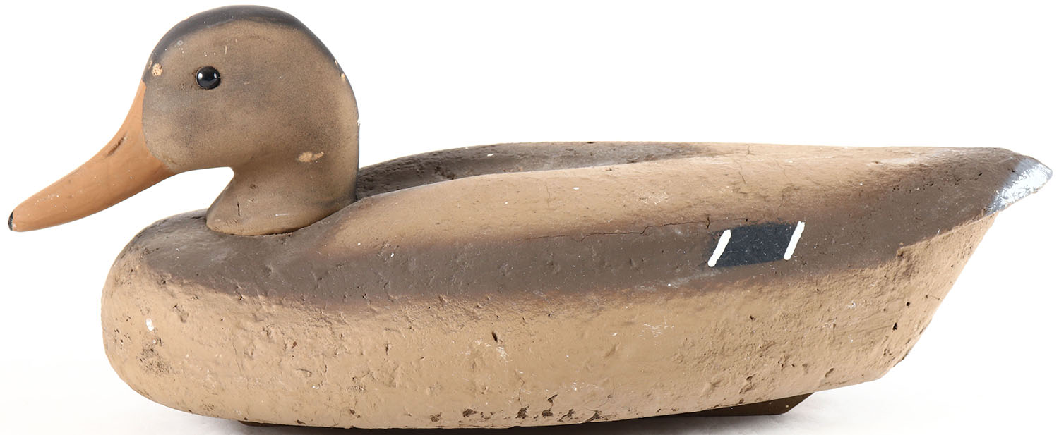 Mallard Hen by unknown factory, possibly LL Bean, glass eyes, solid cork body, original paint with some flaking, structurally excellent. Grade: Excellent - Value: 10 to 40