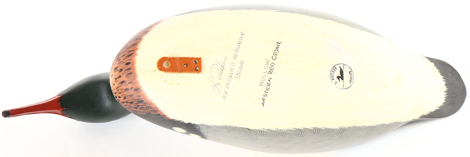 Red Breasted Merganser by L. Rucker, Maple Valley WA, glass eyes, overall length is 18 inches, hollow wood, mint original paint. Grade: MINT - Value: 100 to 200