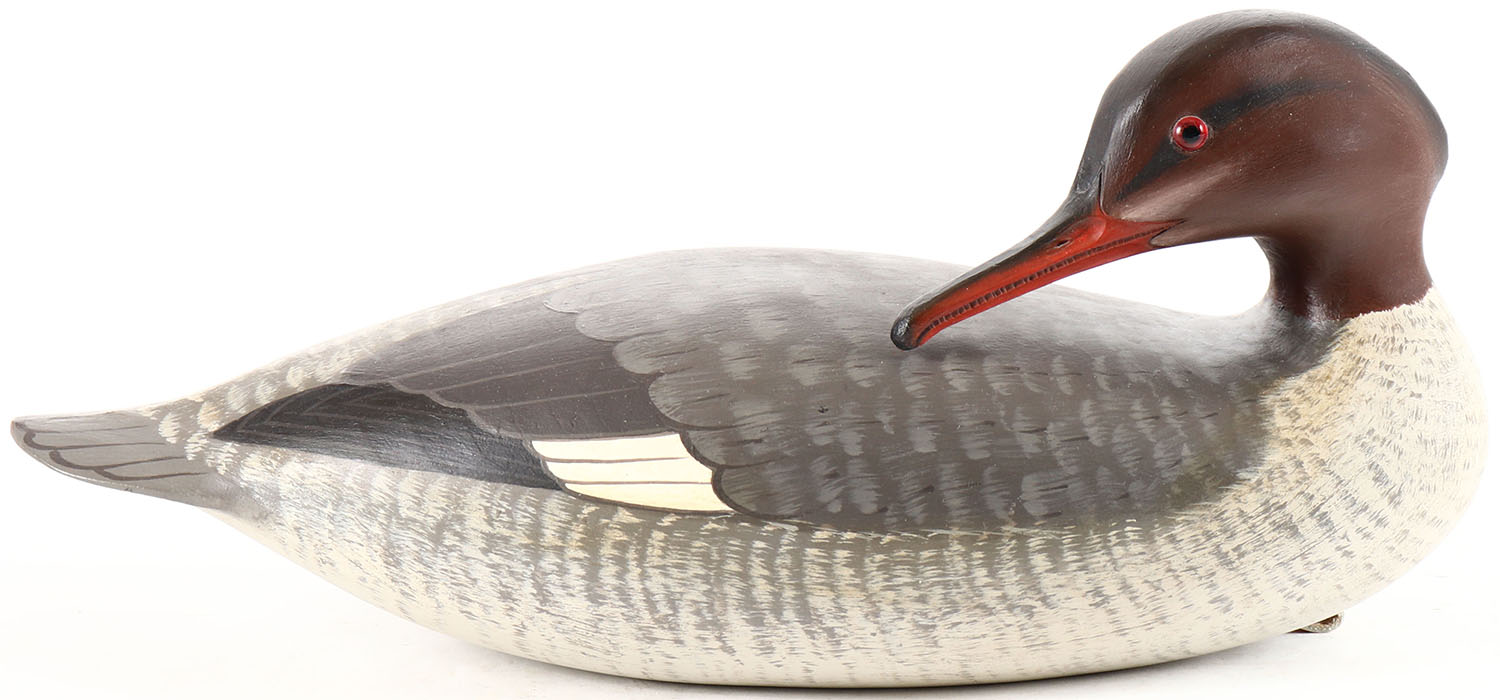 Red Breasted Merganser by L. Rucker, Maple Valley WA, glass eyes, 14 inches, solid wood, mint original paint. Grade: MINT - Value: 100 to 200