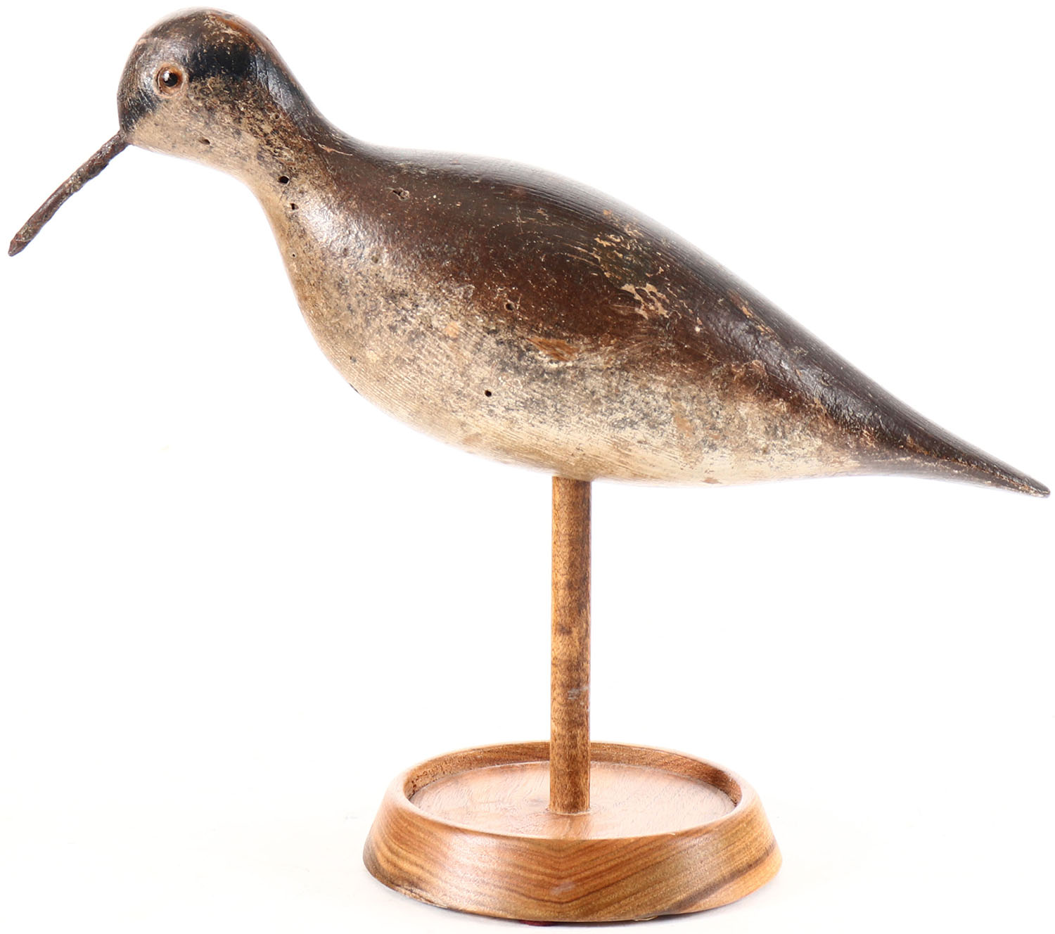 Mason Yellowlegs Shorebird by the Mason Decoy Co., glass eyes, solid wood, thw following is a quote on the bottom of the decoy stand: 'Rare Lesser Yellowlegs with Glass Eyes by the Mason Decoy Factory. Obtained by Mort Hanson from Bill Mackey. Condition: Original paint with minor discoloration and wear; lightly hit by shot; hairline crack in back and near bill (Ex-Mort Hanson Collection). Exact Decoy on Page 126 of Mason Decoys by Byron Cheever. Bottom Photo - Bill repair next to head. Grade: Good - Value: 800 to 1200