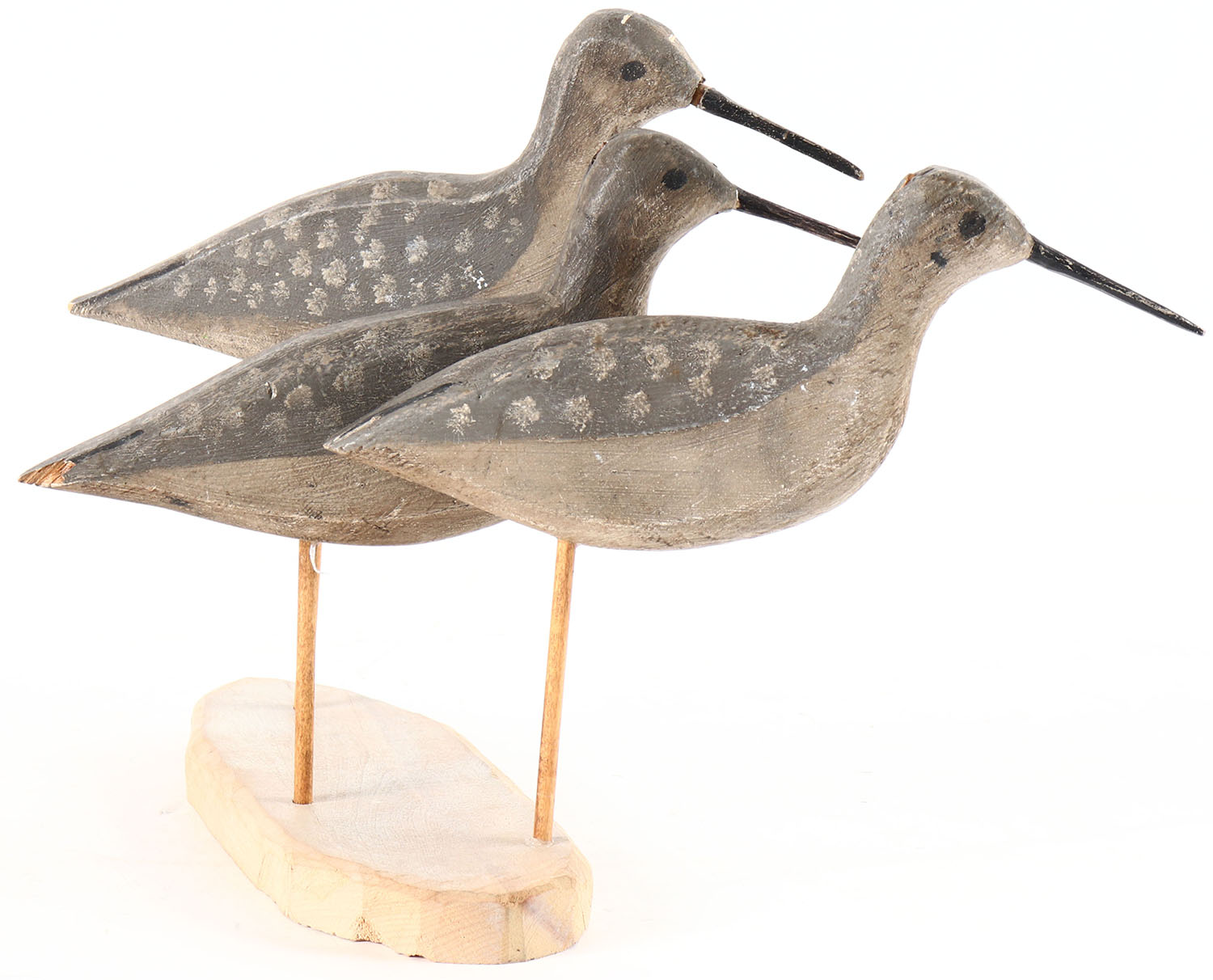 Lot of three Yellowlegs flatties, by unknown maker, painted eyes, on wood stand, original aged paint, illegible signature on bottom. Grade: Very Good ++ - Value: 30 to 60
