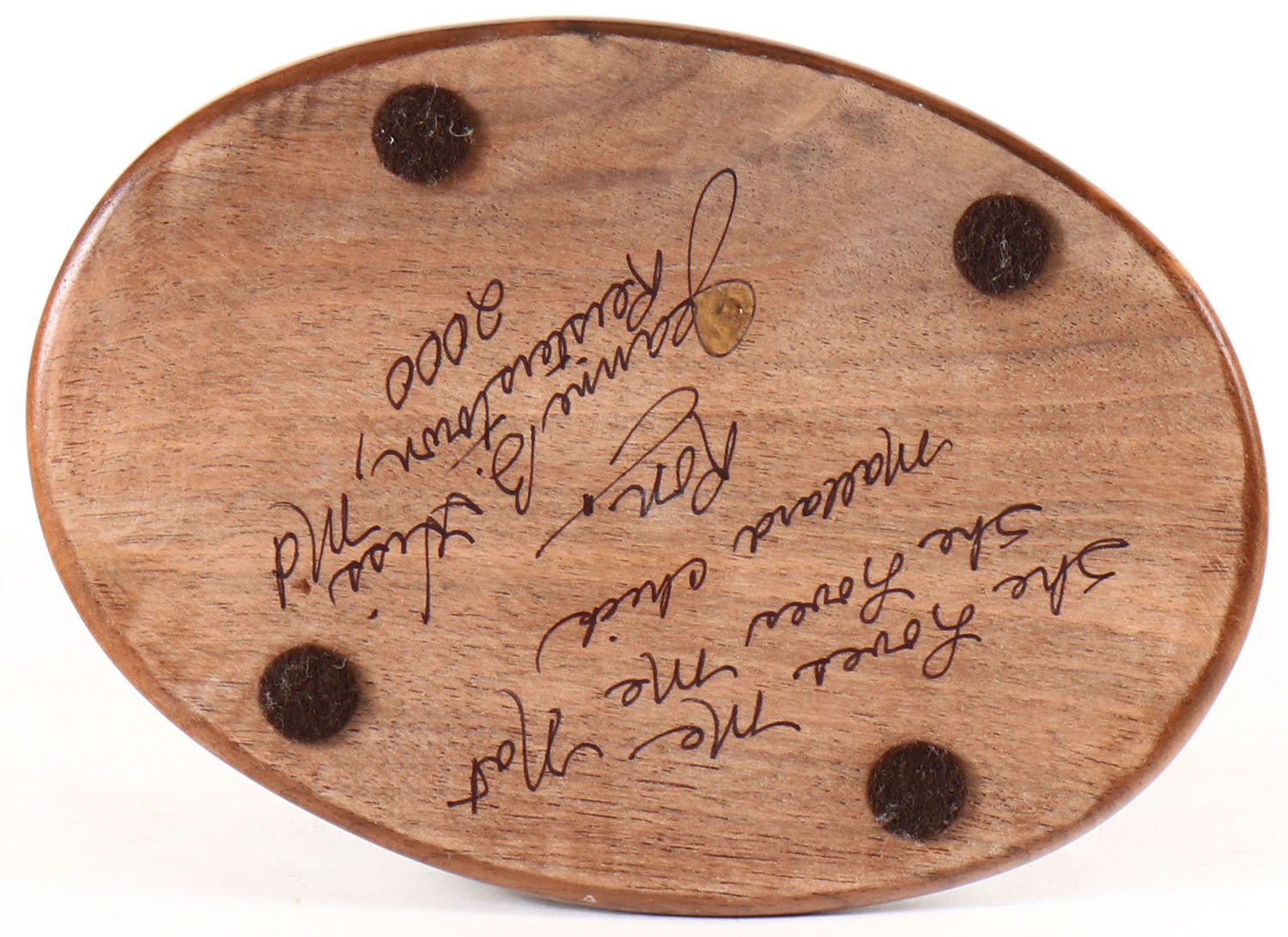 Mallard Chick ''She loves me, she loves me not'' by Jeanne B. Hiss, Reistertown, MD, glass eyes, solid wood on wood base, has flowers on base, original paint, structurally excellent, signed on bottom. Grade: MINT + - Value: 10 to 50