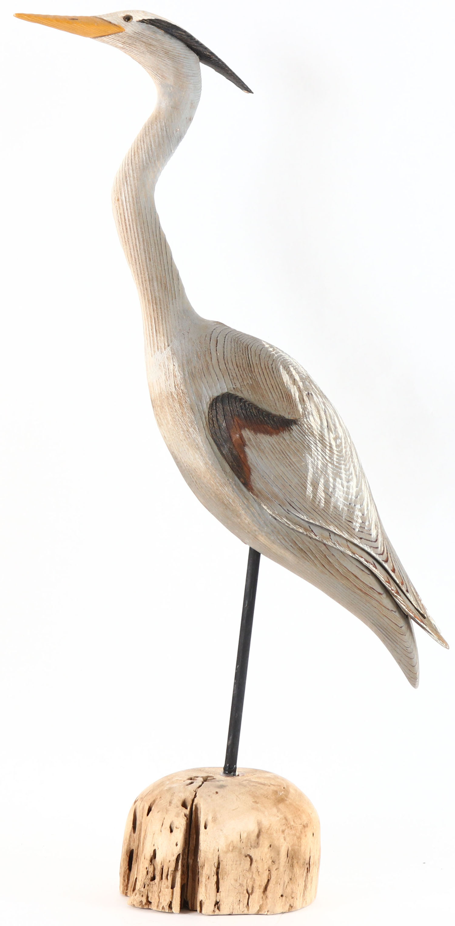 Blue Heron, by Walt Oler, Beach Haven, NJ, glass eyes, half size at 22 tall, solid wood on wood stand, original paint, structurally excellent. Grade: Excellent - Value: 20 to 40