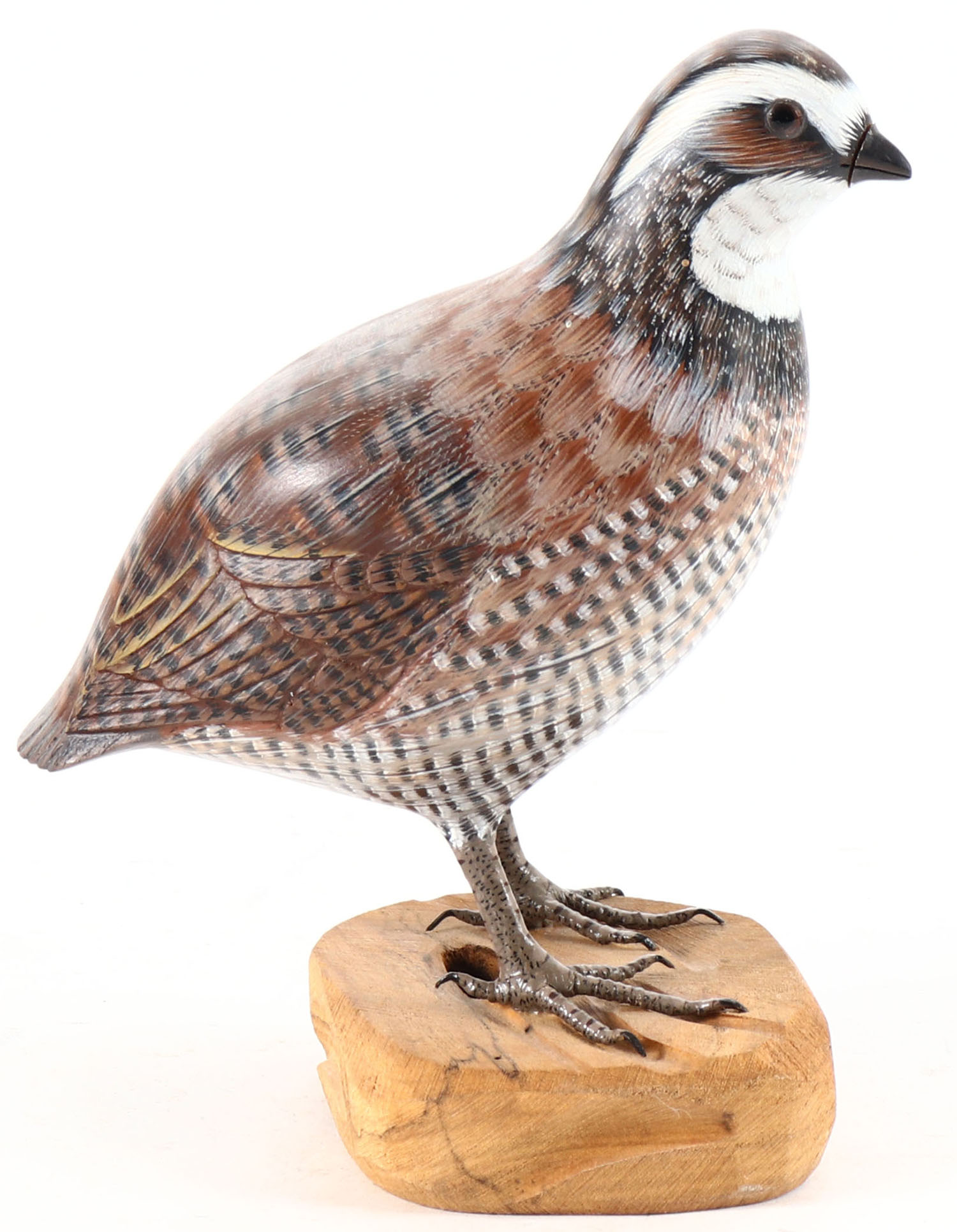 Bobwhite Quail by unknown maker, glass eyes, solid wood, original paint, structurally excellent. Grade: Excellent + - Value: 6 to 20