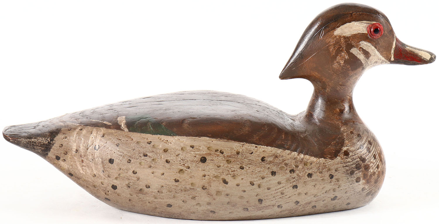 Woodduck Hen by unknown maker, glass eyes, solid wood, original paint, structurally excellent. Gade: Excellent + - Value: 10 to 40