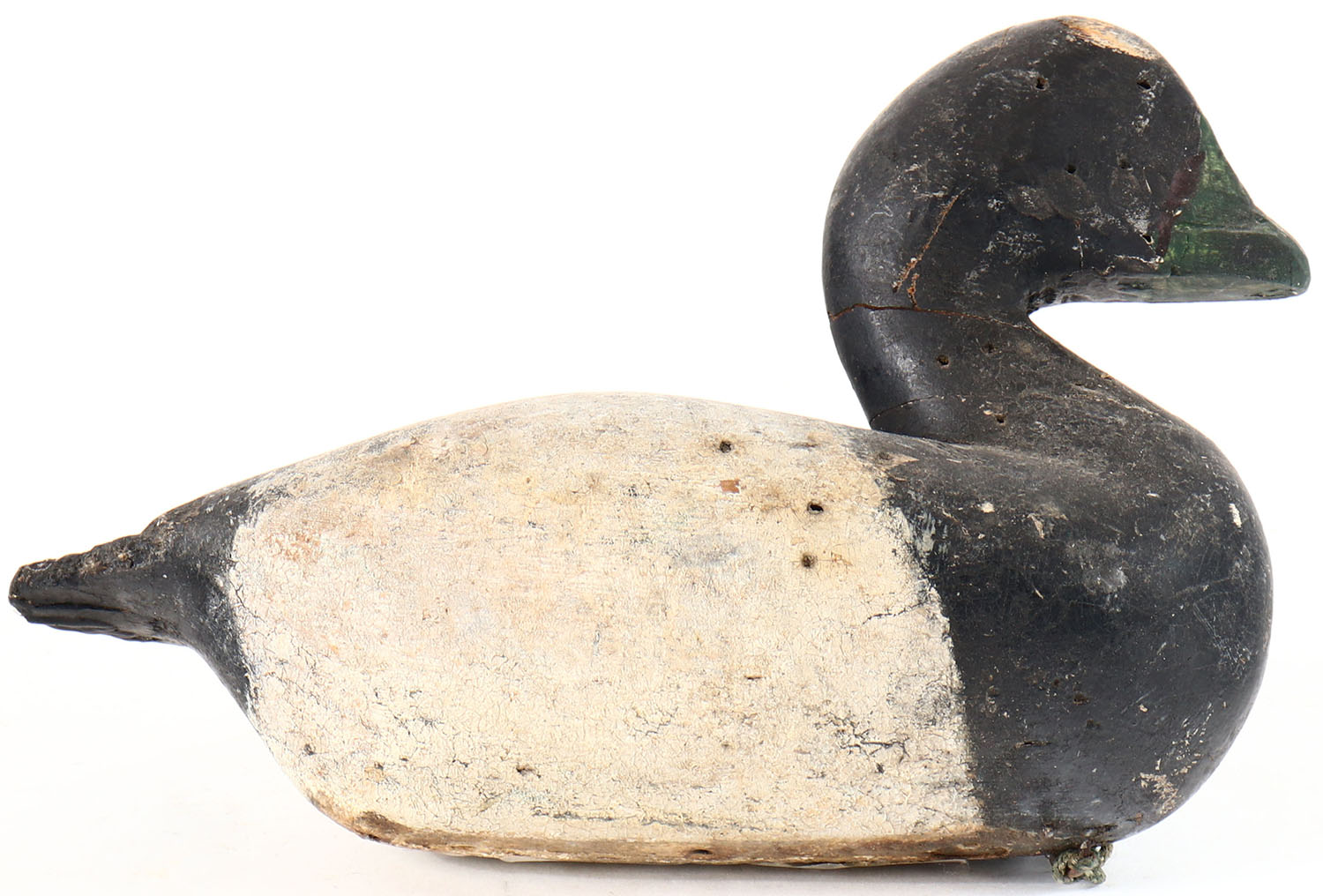 Bluebill Drake by unknown maker, no eyes, solid wood, original paint, neck has cracks. Grade: Very Good + - Value: 10 to 20