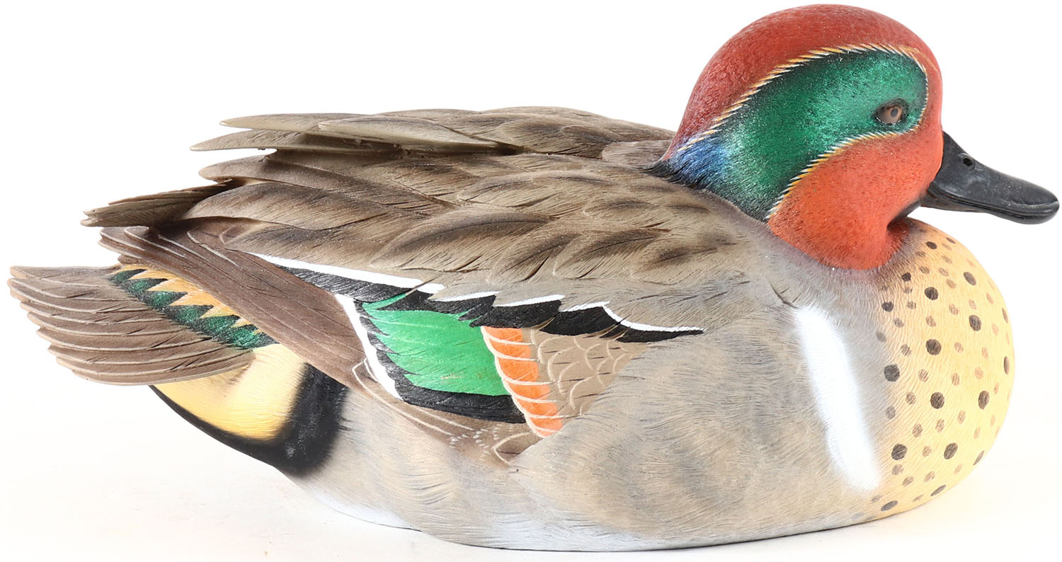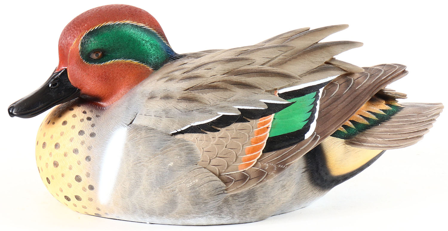 Green Winged Teal Drake by Ducks Unlimited, glass eyes, solid wood, original paint, structurally excellent, branded by DUCKS UNLIMITED on bottom. Grade: MINT - Value: 20 to 60