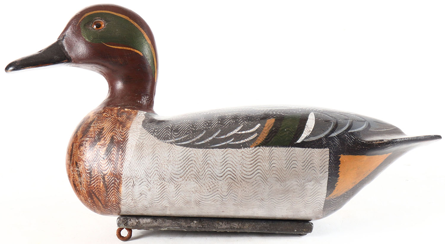 Green Winged Teal Drake by Charlie Moore, Dekalb, IL, glass eyes, Charlie Perdew model with contemporary Perdew weight, solid wood, original paint, structurally excellent. Grade: Excellent + - Value: 40 to 80