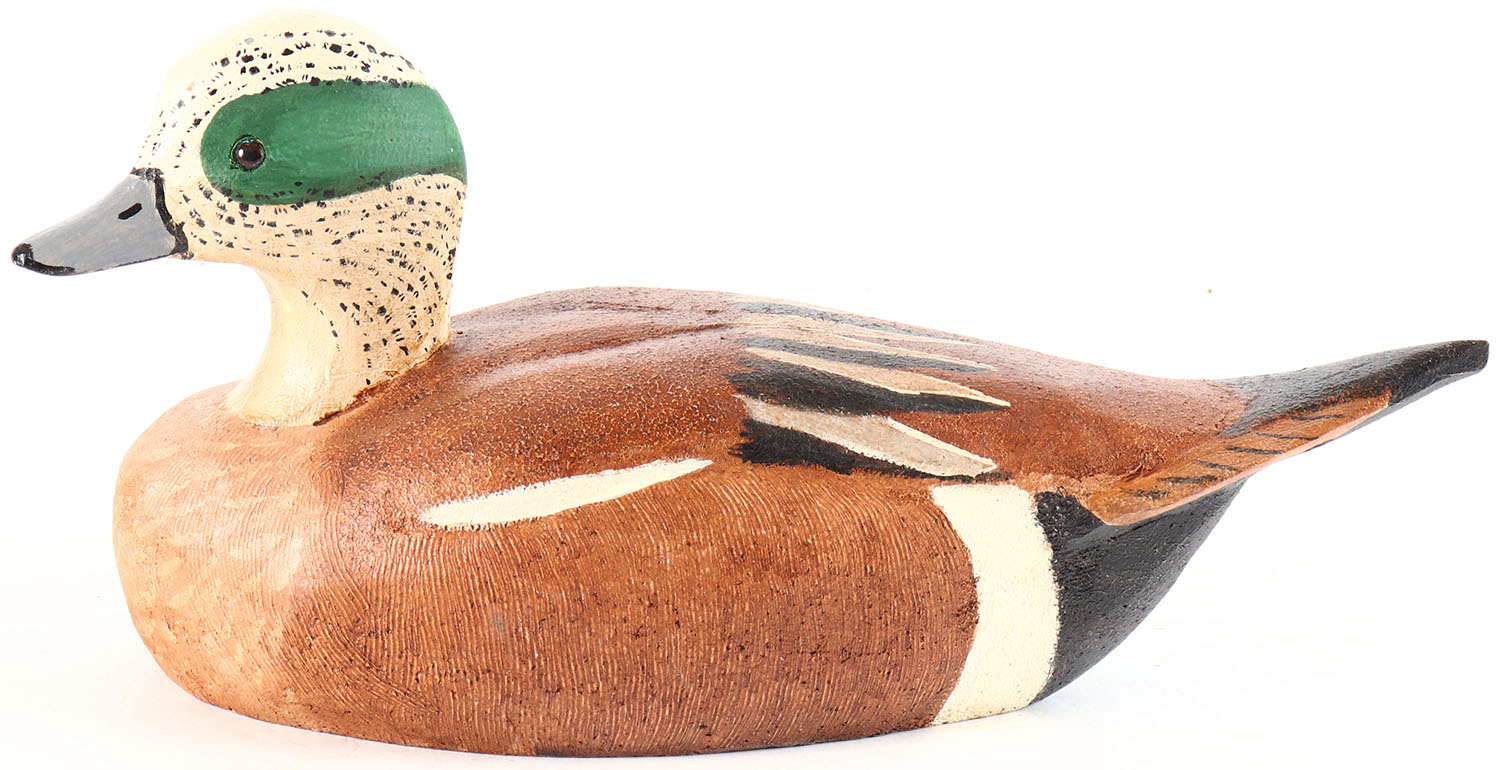 Widgeon Drake by Dennis Finden, South St. Paul, MN, glass eyes, solid cork body, repainted, structurally excellent, signed by DENNIS FINDEN on bottom. Grade: Excellent + - Value: 10 to 30