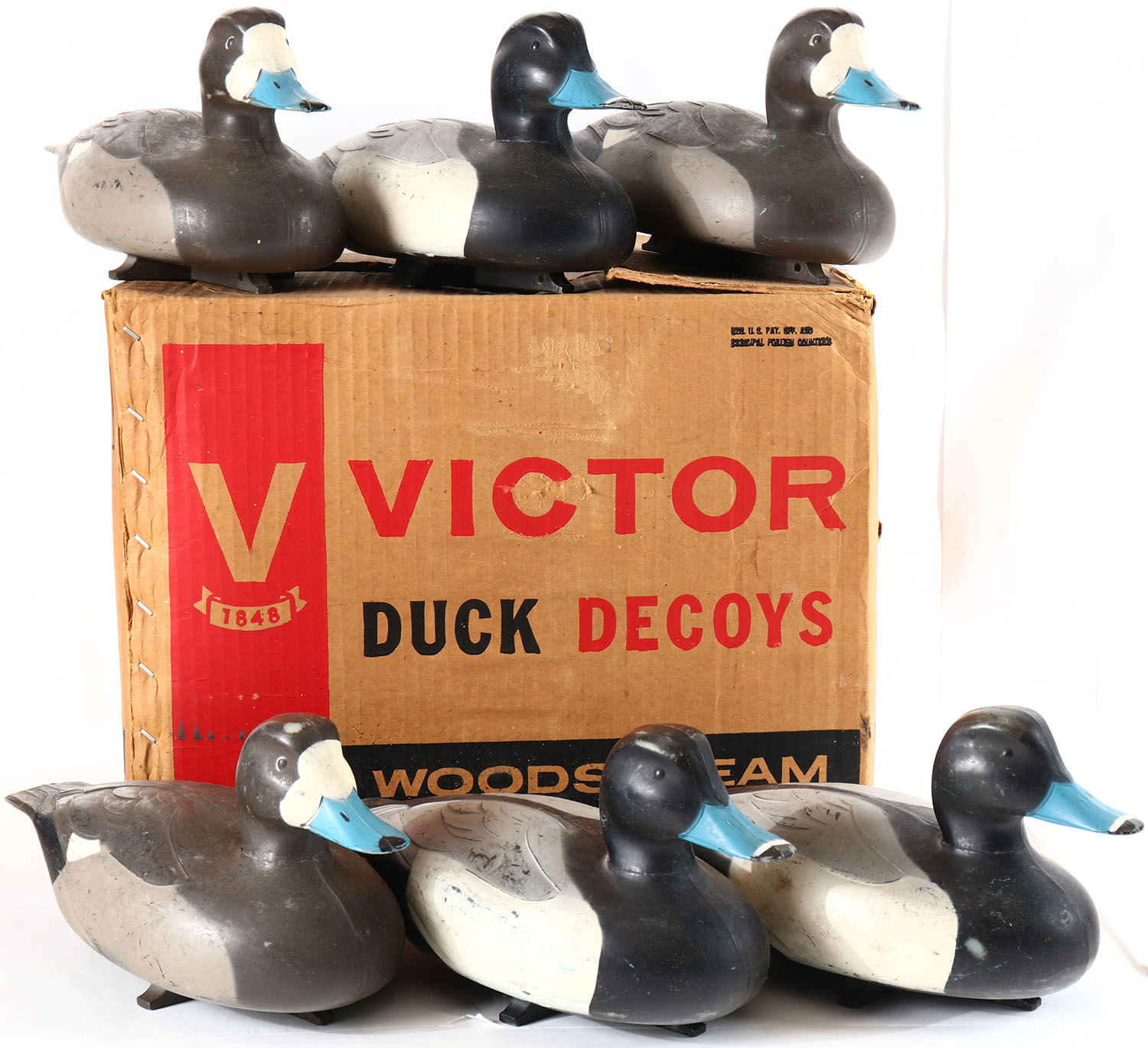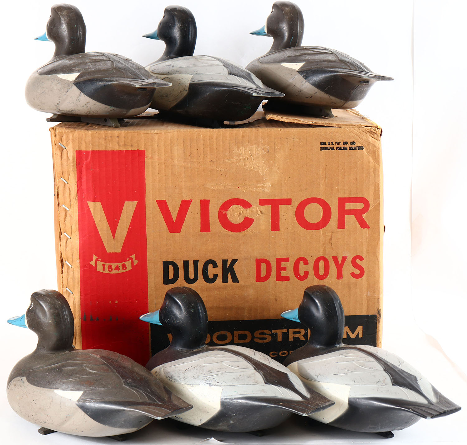 Full Case of 6 Bluebill Ducks by Victor Animal Trap Co. Lititz, PA, in the original box, rare to find the original box. Grade: MINT - Value: 100 to 300