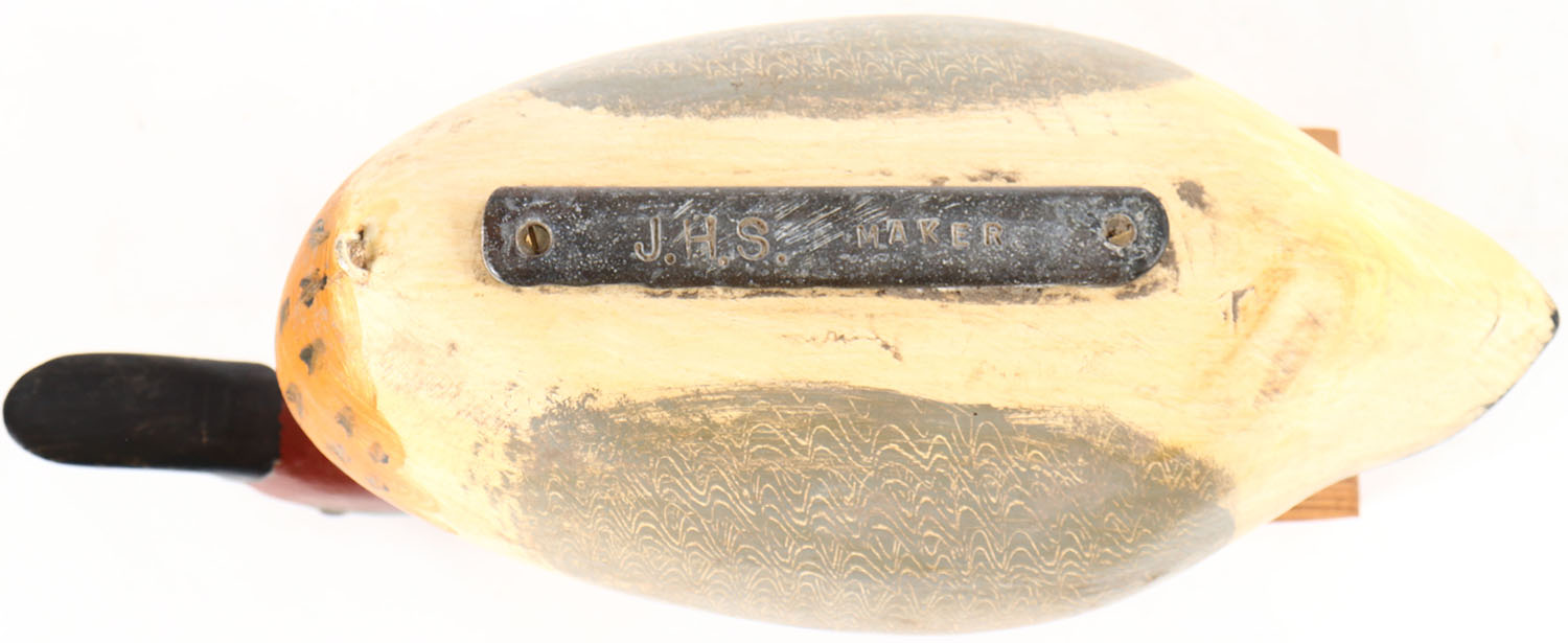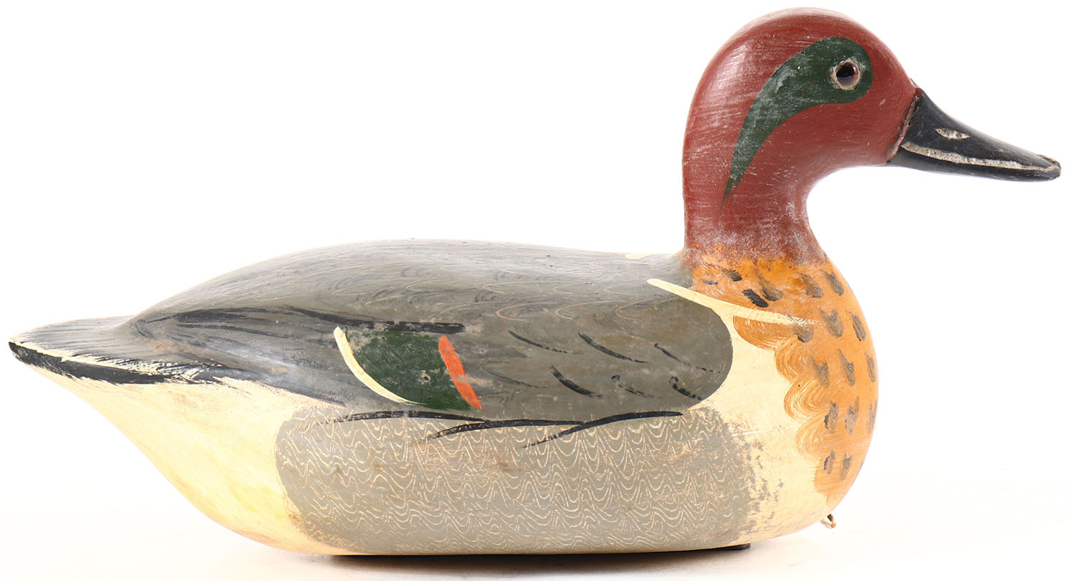 Green Winged Teal Drake by Jim Slack, Pekin, IL, glass eyes, solid wood, original paint, structurally excellent, branded weight. Grade: Excellent + - Value: 60 to 120