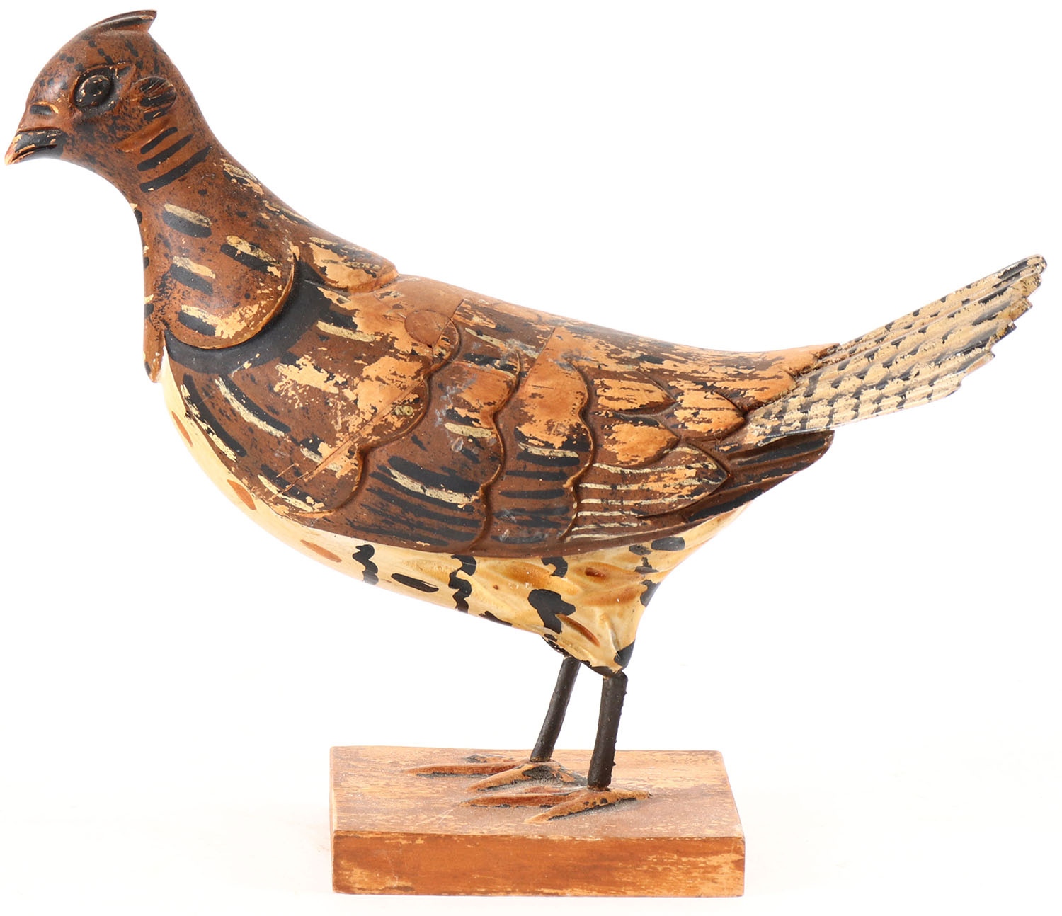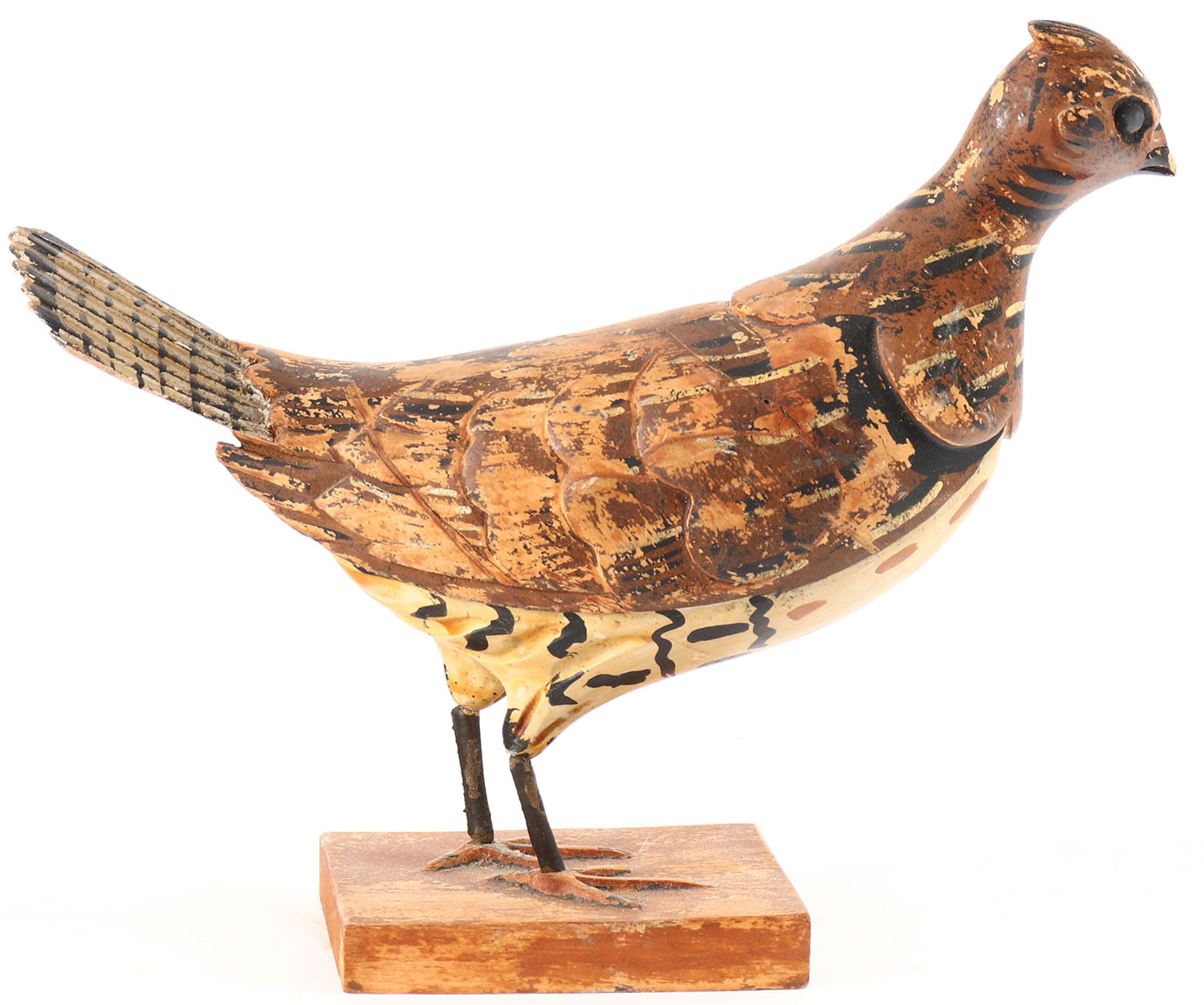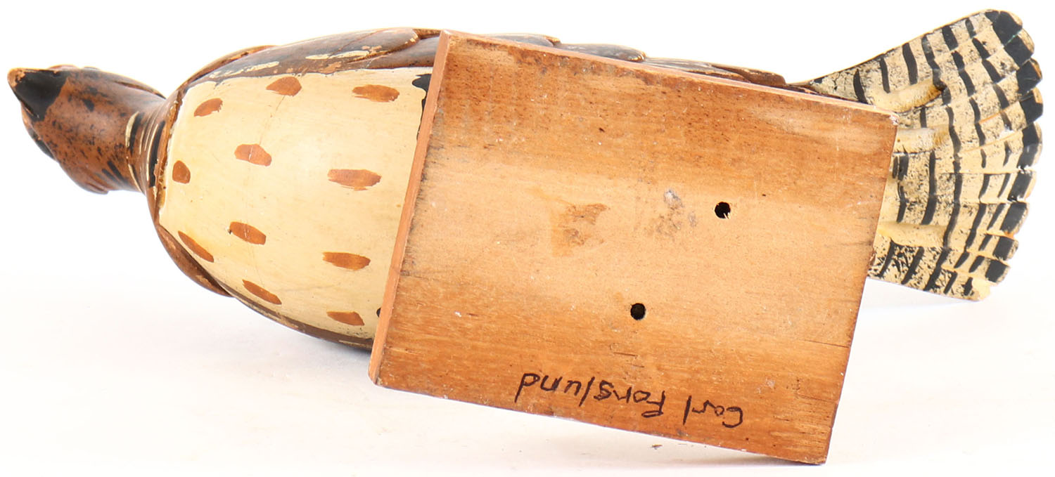Ruffed Grouse by Carl Forglund, tack eyes, solid wood on wood stand, original paint, structurally excellent. Grade: Very Good ++ - Value: 20 to 40