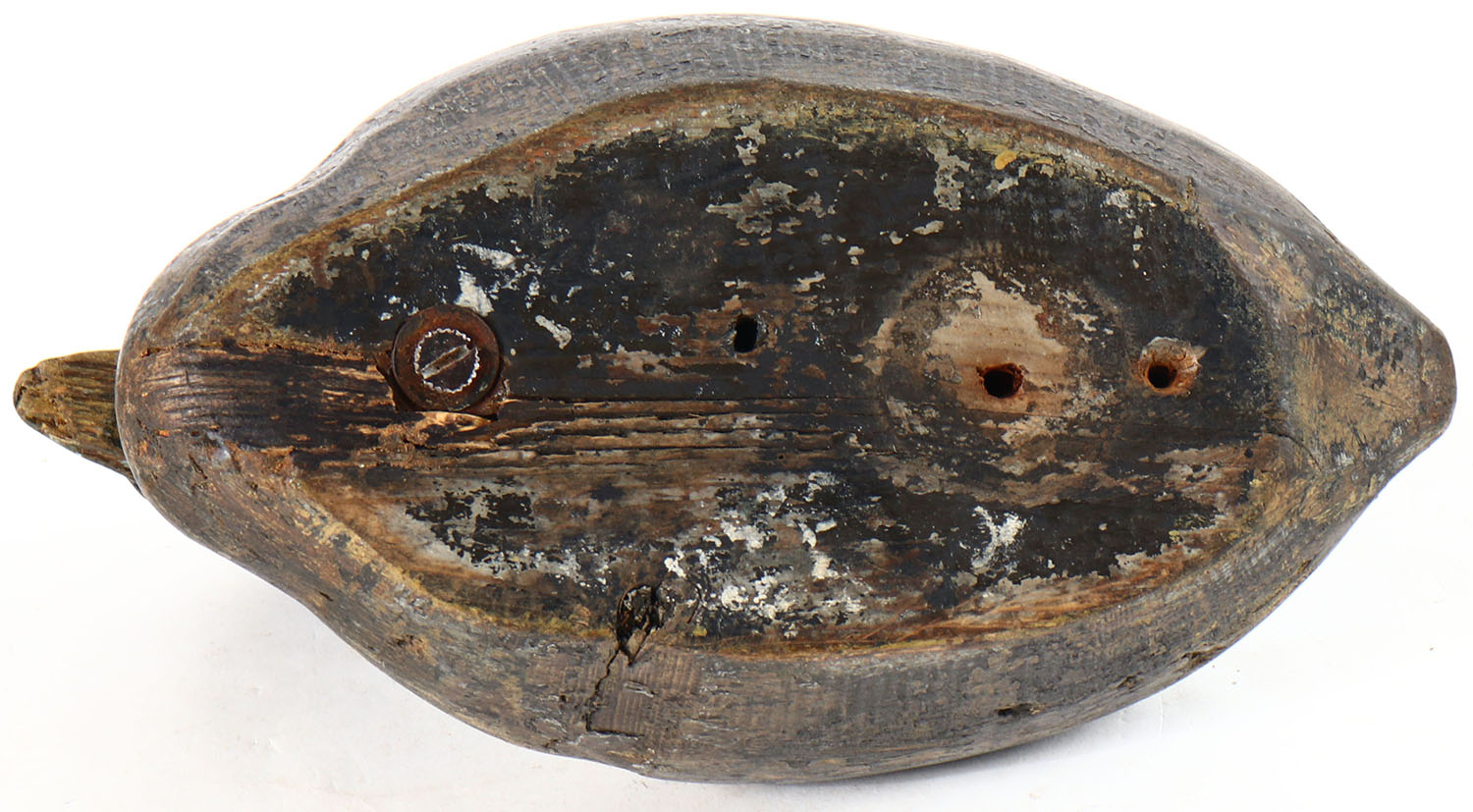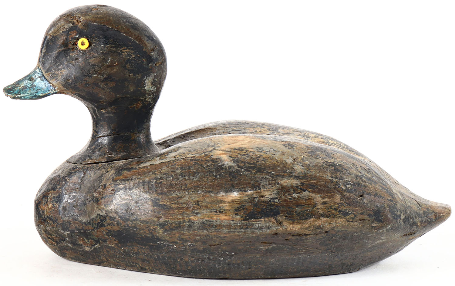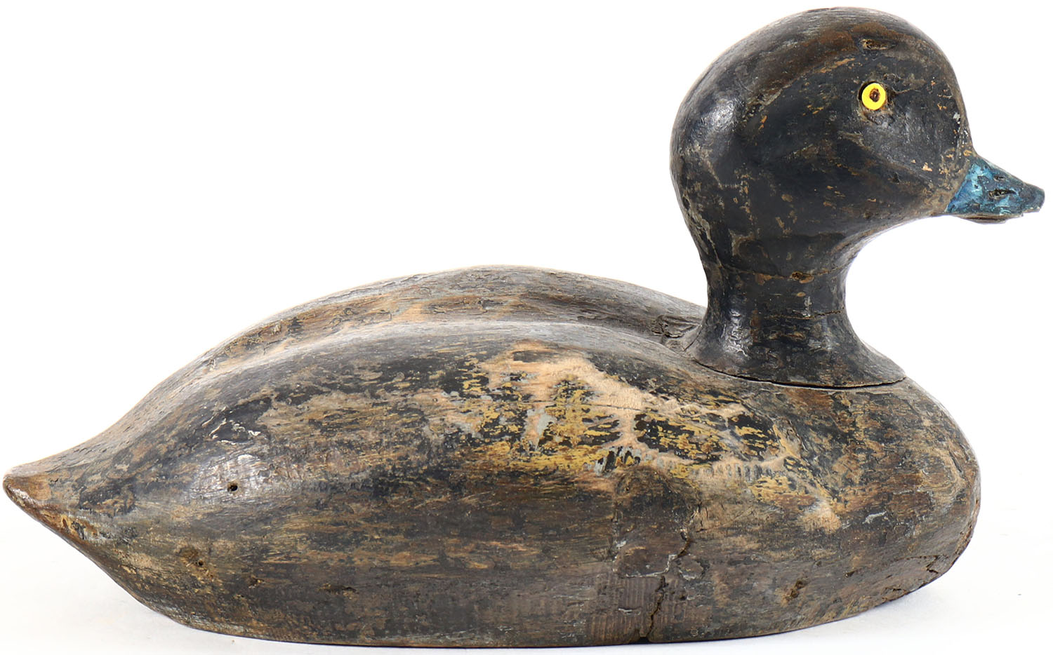 Bluebill Drake by unknown maker, tack eyes, hollow wood, repainted, has age cracks on back and bottom. Grade: Very Good - Value: 10 to 30