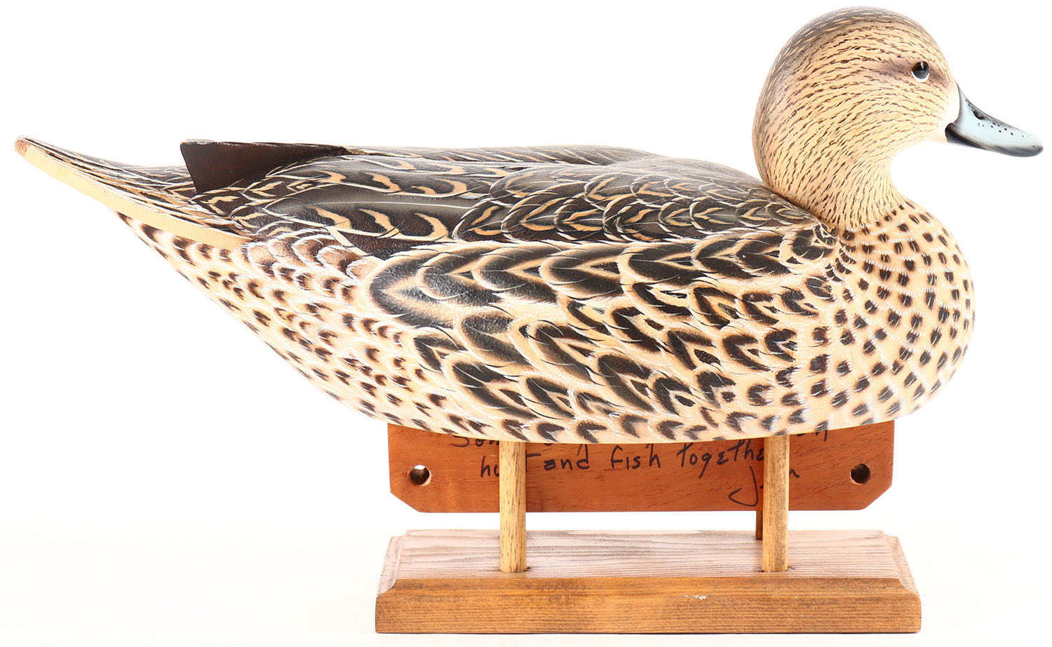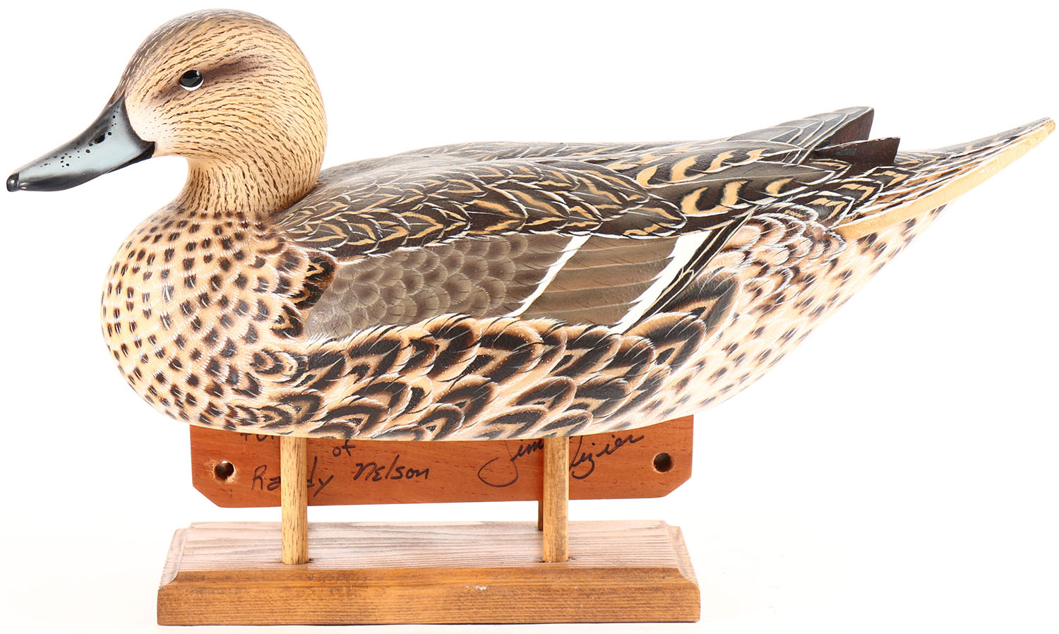 Pintail Hen by multiple world champion Jimmie Vizier, Galliano, LA, for Randy Nelson, on wood stand, glass eyes, solid wood, original paint, structurally excellent with small tail end rub, signed on bottom. Grade: MINT - Value: 400 to 700