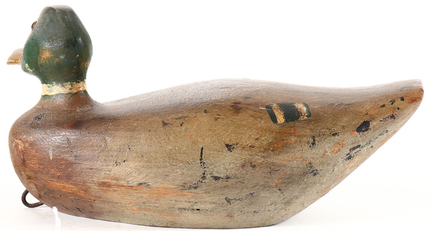 Mallard Drake by unknown maker, glass eyes, solid wood, original paint, has age cracks on back. Grade: Very Good ++ - Value: 10 to 40