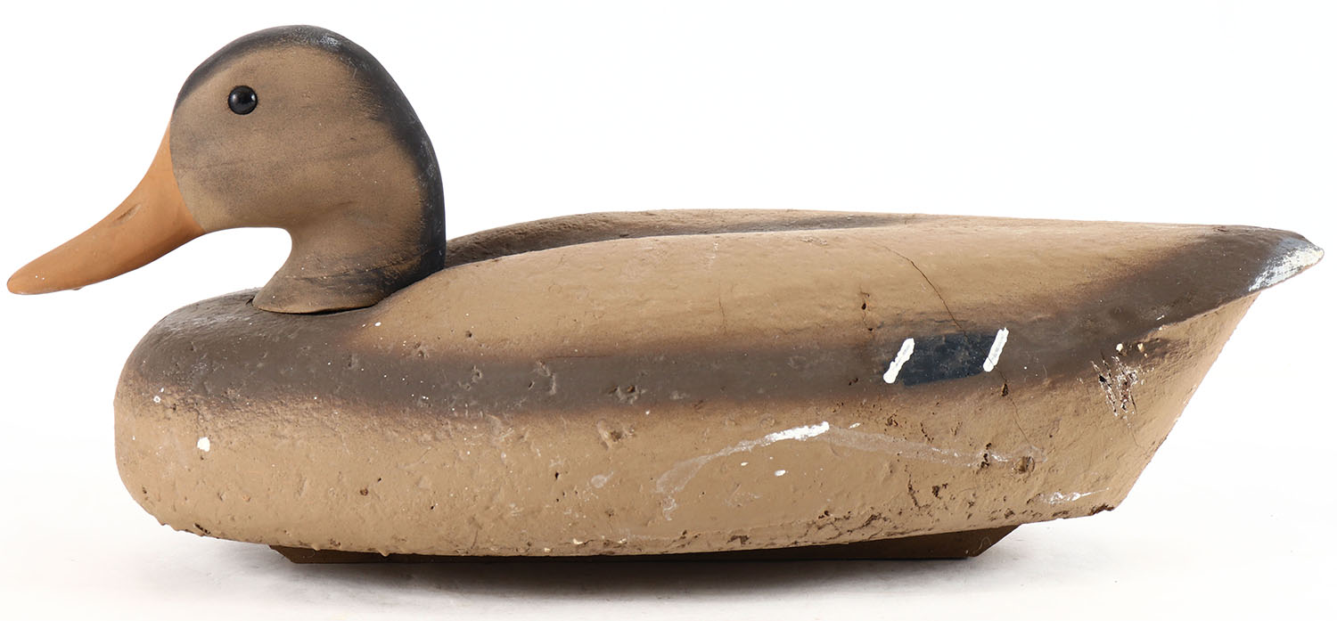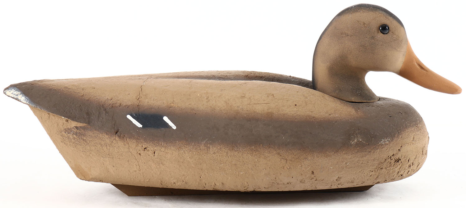 Mallard Hen by unknown factory, glass eyes, solid cork body, wood head, original paint, structurally excellent. Grade: Excellent - Value: 10 to 40