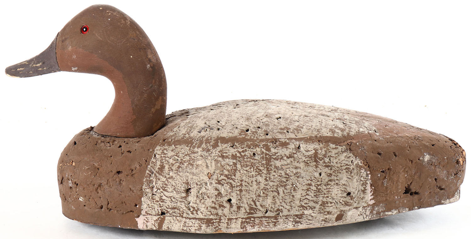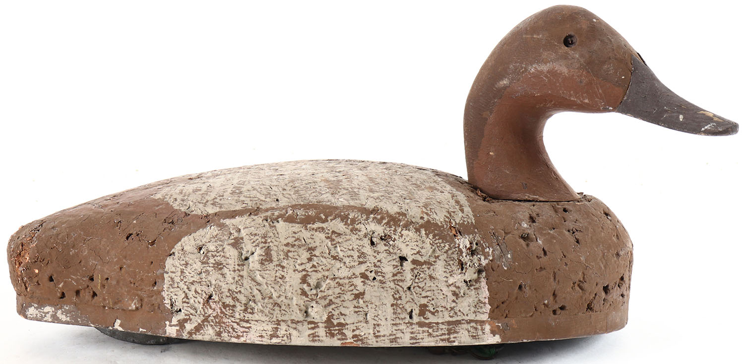 Canvasback Hen by unknown maker, glass eyes, one eye is missing, solid cork body, original paint, structurally excellent. Grade: Excellent - Value: 10 to 30
