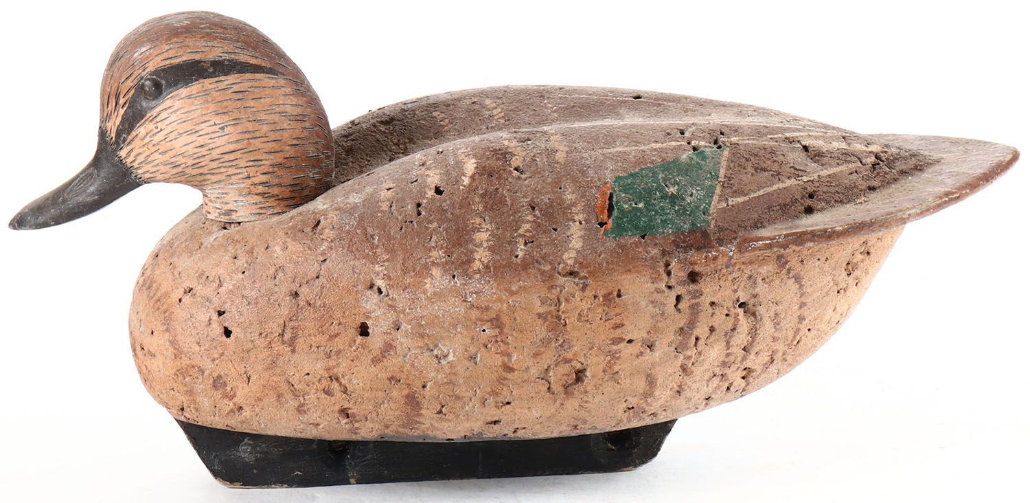 Green Winged Teal Hen by unknown maker, glass eyes, solid cork body, original paint, structurally excellent. Grade: Excellent - Value: 10 to 40