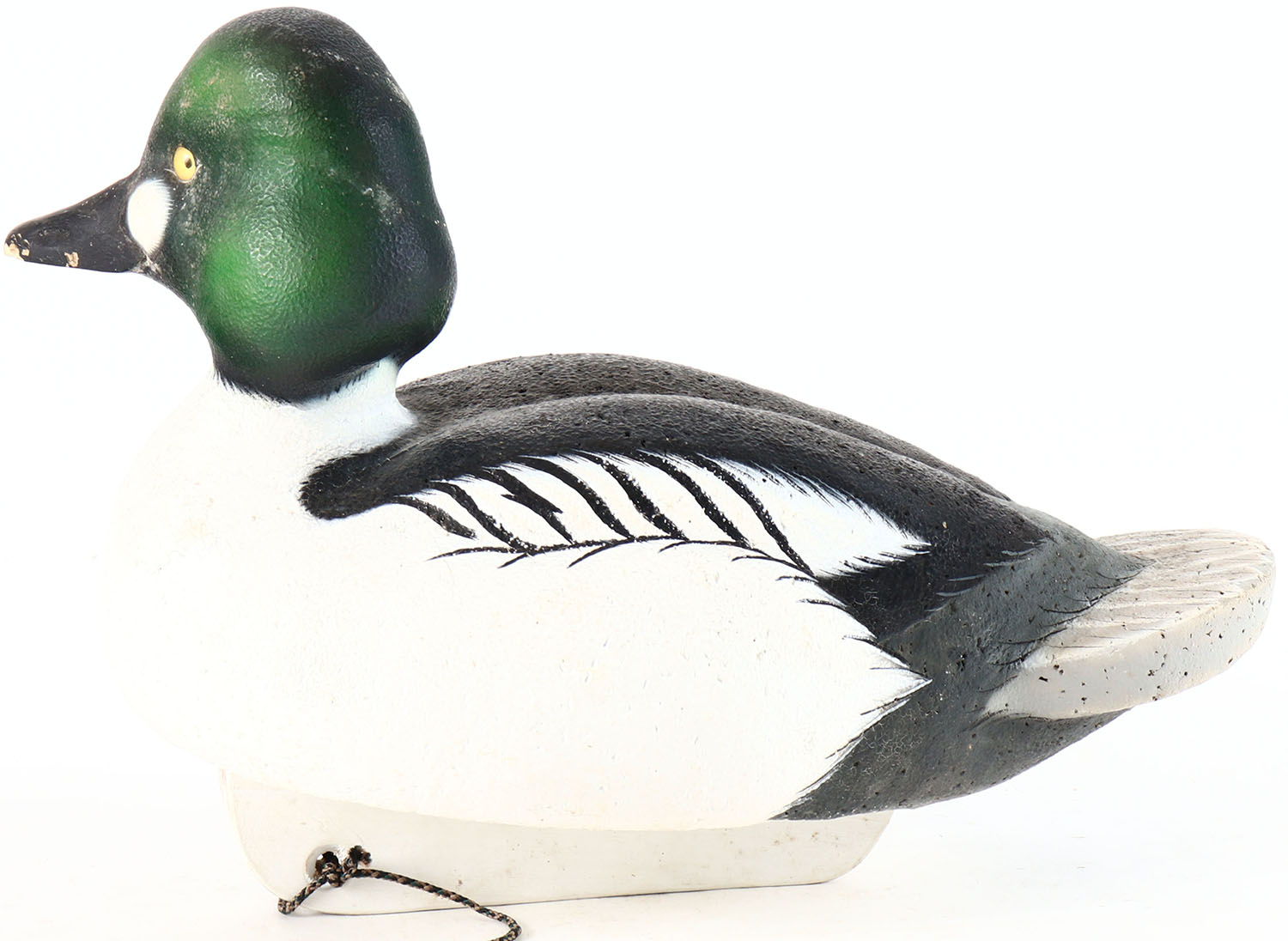 Goldeneye Drake by Willy McDonald, glass eyes, solid cork body, original paint, has chips on bill. Grade: Very Good ++ - Value: 10 to 40