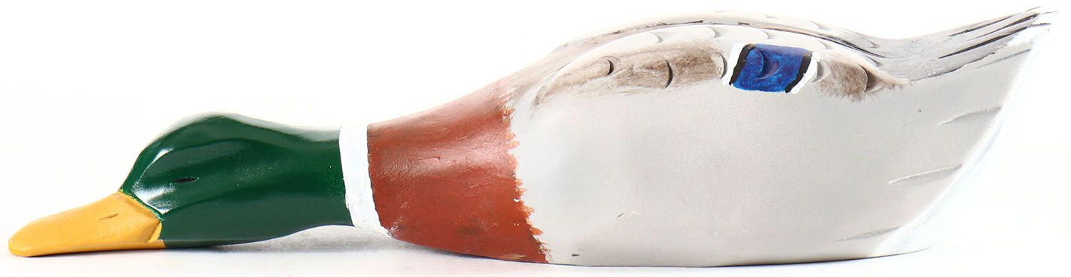Swimming Mallard Drake by unknown maker, painted eyes, solid wood, original paint, has some wear to paint on each side of body. Grade: Very Good + - Value: 10 to 30