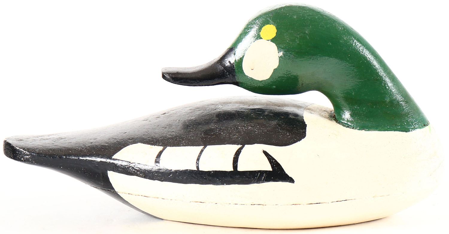 Preening Goldeneye Drake by unknown maker, painted eyes, solid wood, original paint, structurally excellent. Grade: Excellent - Value: 10 to 30