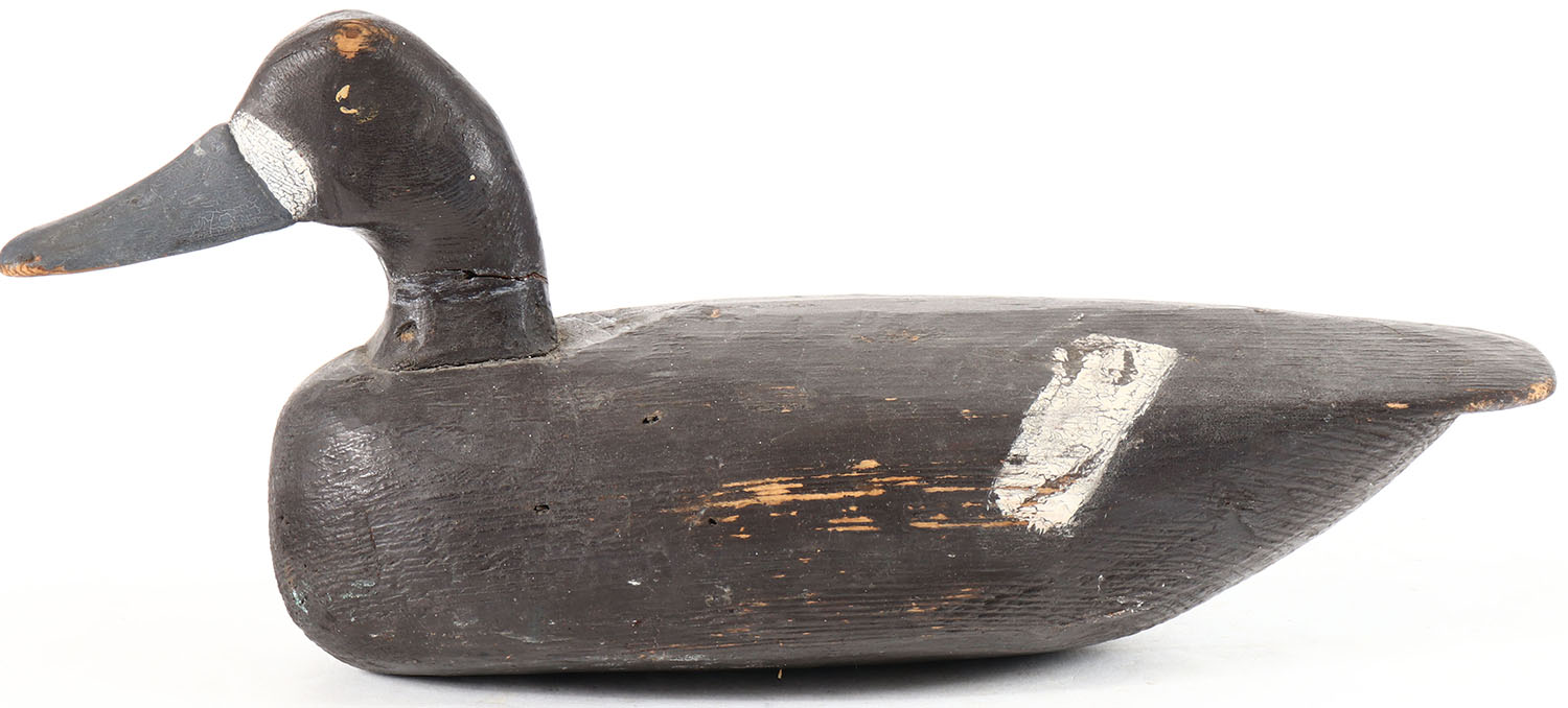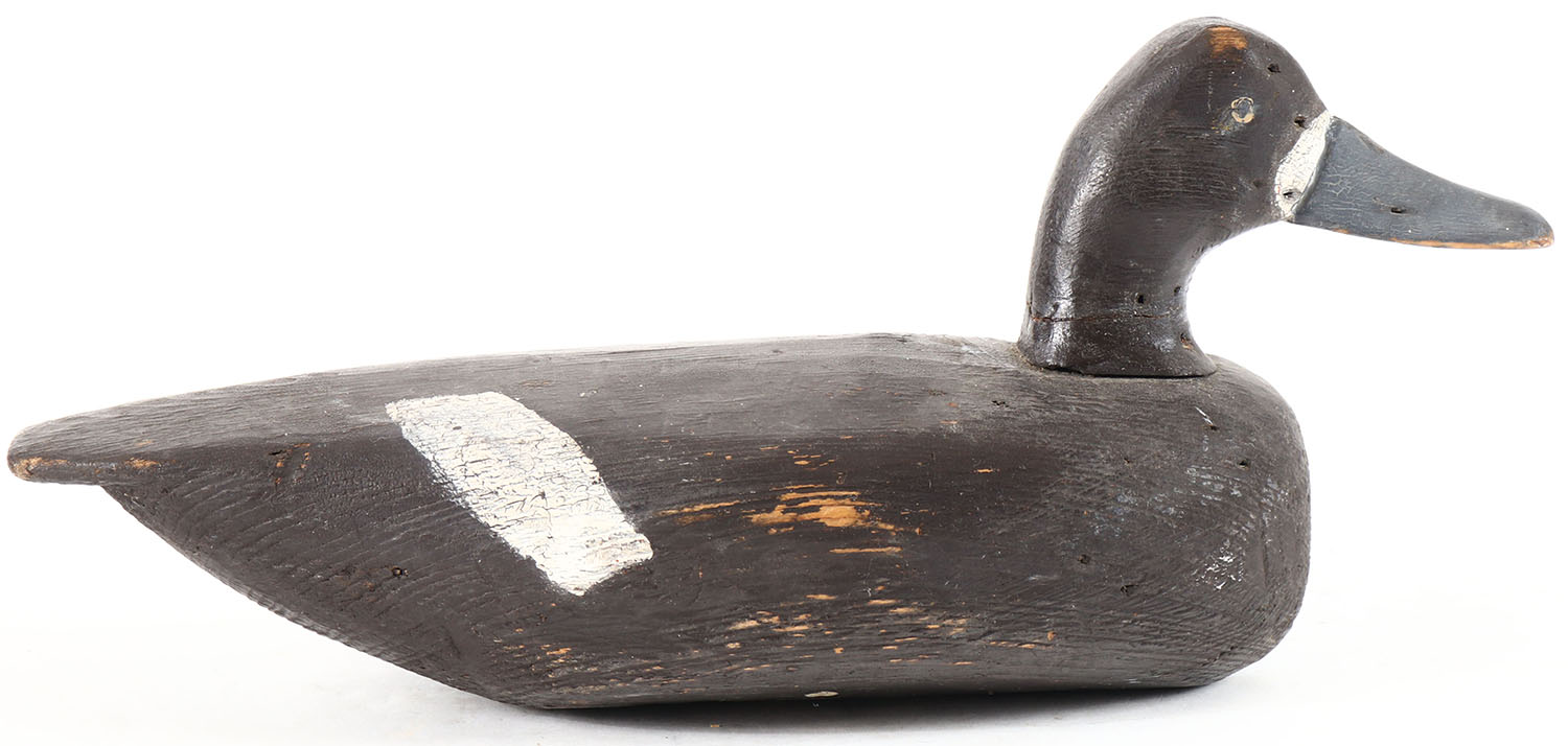 Bluebill Hen by unknown maker, painted eyes, solid wood, original paint, has age cracks on entire body. Grade: Very Good - Value: 10 to 30