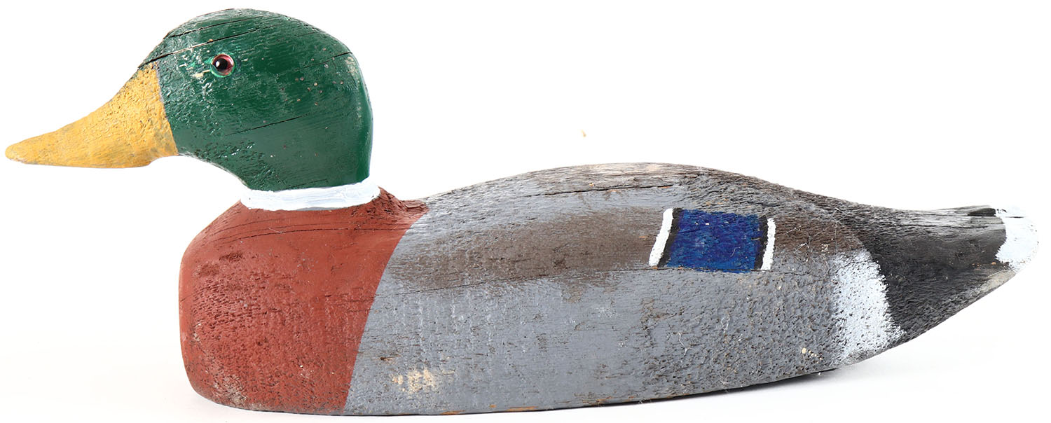 Mallard Drake by unknown Pascagoula, MS, glass eyes, solid wood, repainted, has age cracks on back