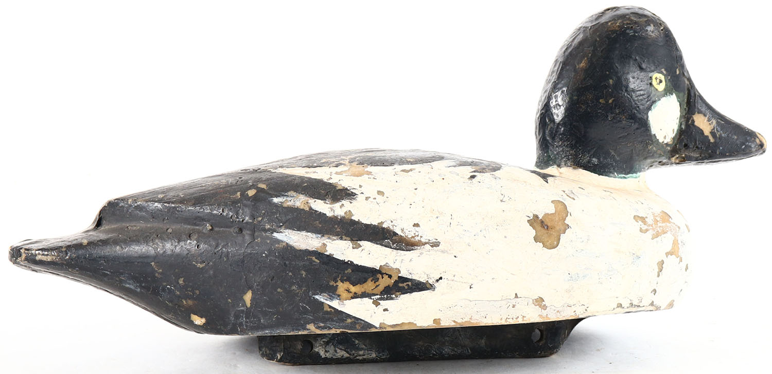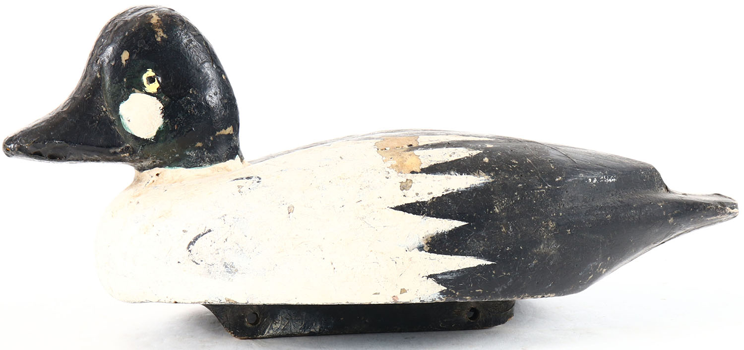 Goldeneye Hen by Reg Bloom, Kingston, glass eyes, hollow wood, original paint, has age cracks on body and head. Grade: Very Good + - Value: 10 to 40