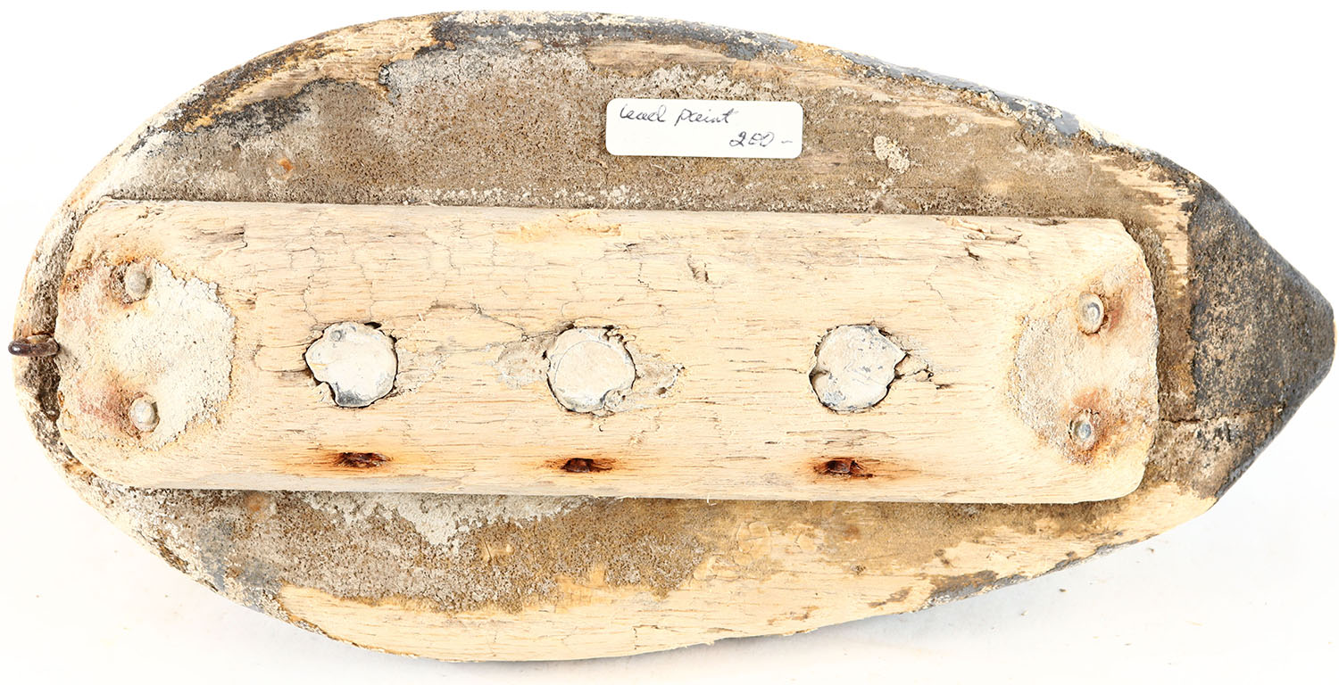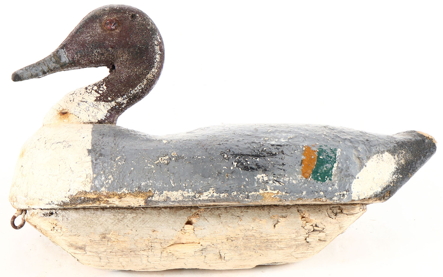 Pintail Drake by unknown maker, tack eyes, solid wood, original paint, age cracks on entire body. Grade: Very Good + - Value: 10 to 20