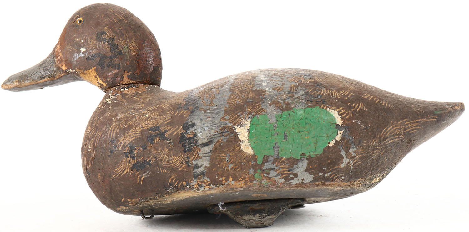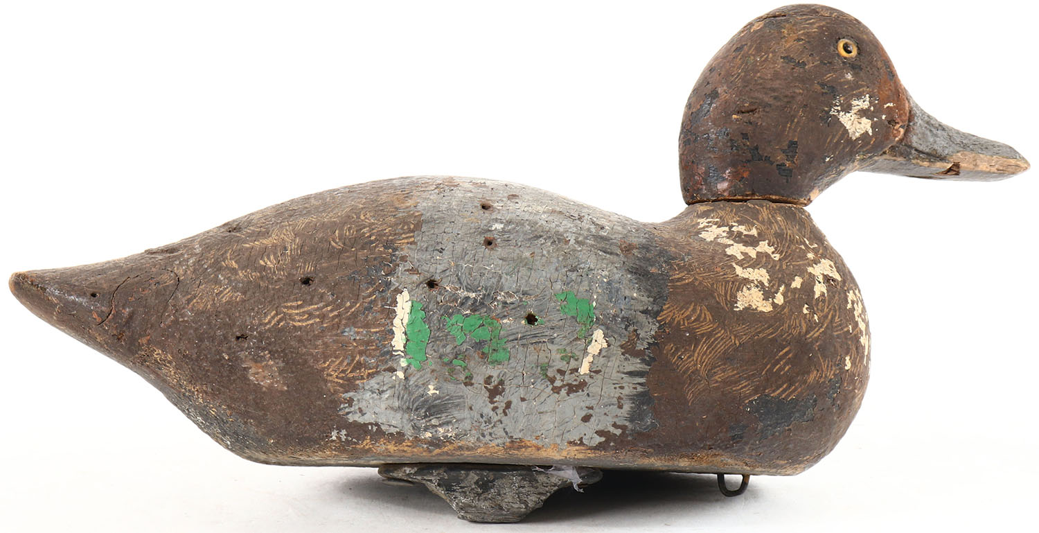 Bluebill Hen by unknown factory, glass eyes, solid wood, working repaint, has paint cracks on body, head is loose. Grade: Very Good - Value: 10 to 20